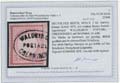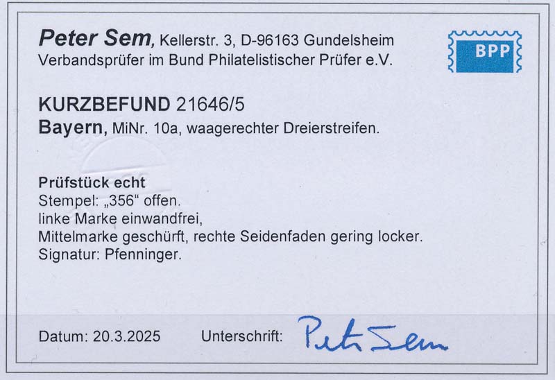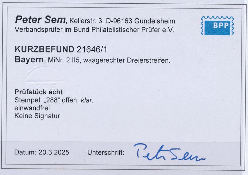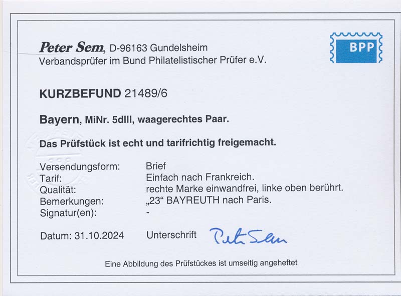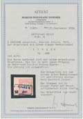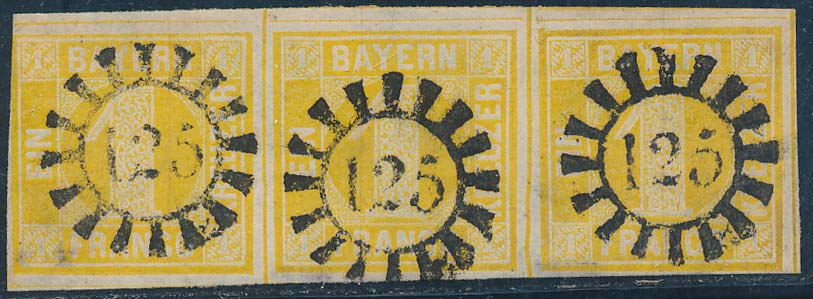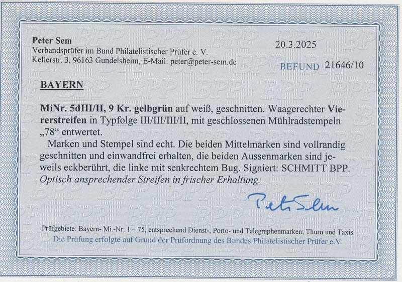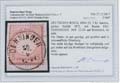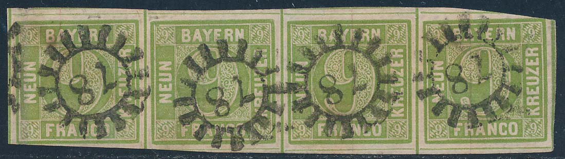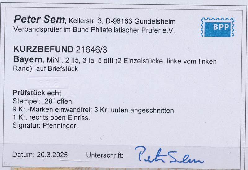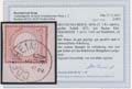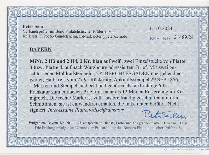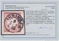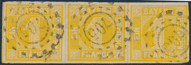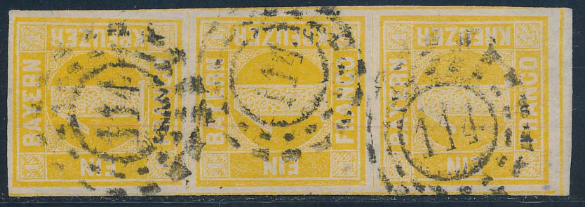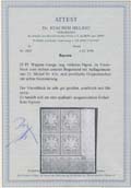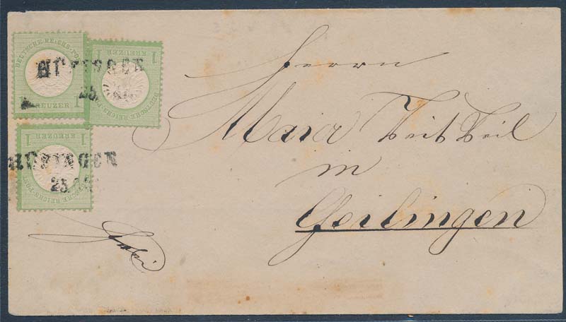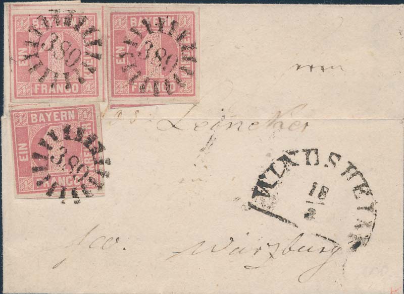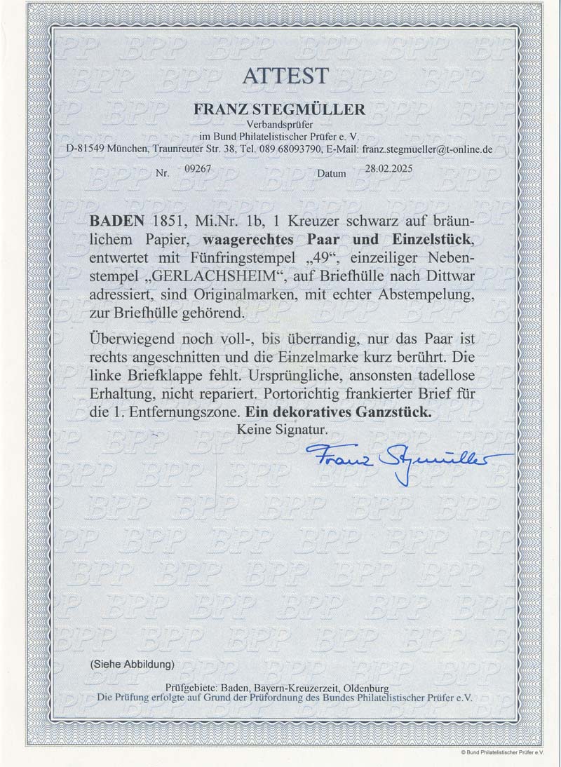 1 Kr. Ziffer Ausg. 1851 "b"-Farbe als MeF von 3 St. (dabei ) auf Bf. mit 3 klaren Nr.-Stpl. "49" u. nebenges. L1 "GERLACHSHEIM" nach Dittmar. Neues Fotoattest Stegmüller "echt, überwiegend noch voll bis überrandig, nur das Paar r. angeschnitten u. die Einzelmarke kurz berührt. Die l. Briefklappe fehlt, ansonsten tadellose Erhaltung, ein dek. Ganzstück!" |
