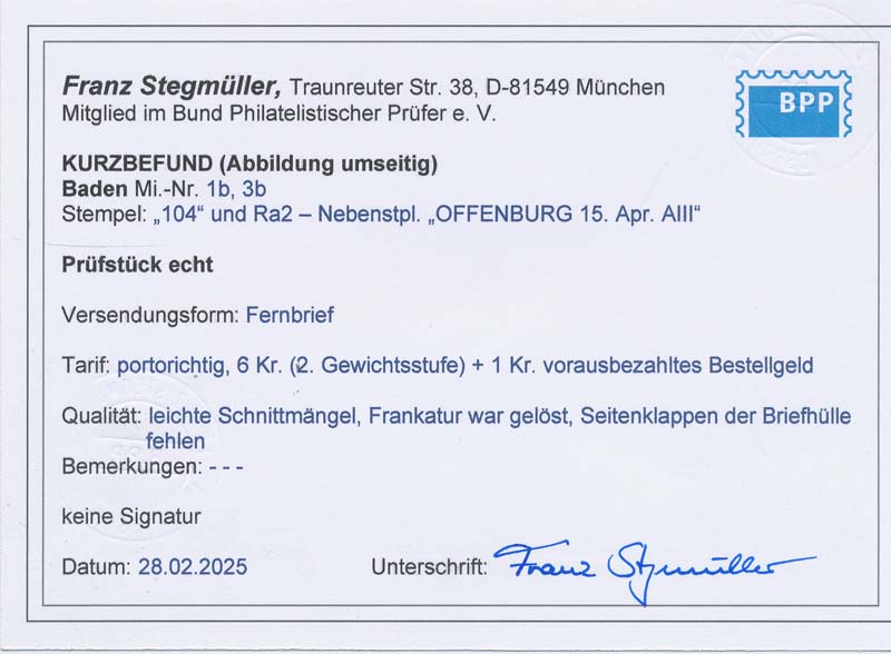 1 u. 6 Kr. Ziffer Ausg. 1851 je "b"-Farbe zusammen auf Bf. (Seitenklappen fehlen) mit vorausbez. Bestellgeld mit 1 zentrischen Nr. Stpl. "104" u. nebenges. Ra2 "OFFENBURG" nach Carlsruhe. Trotz kl. Mängel eine seltene MiF! neuer Kurzbefund Stegmüller |