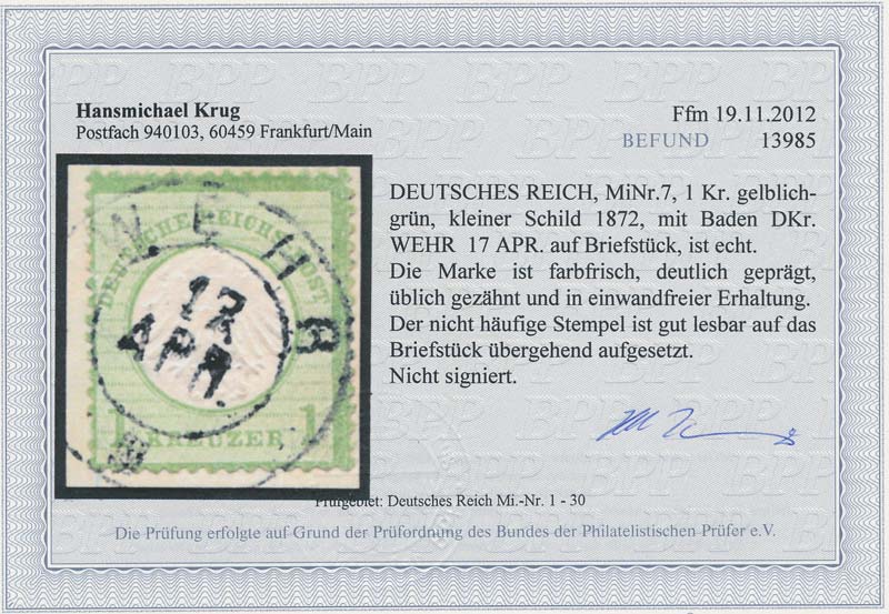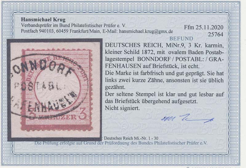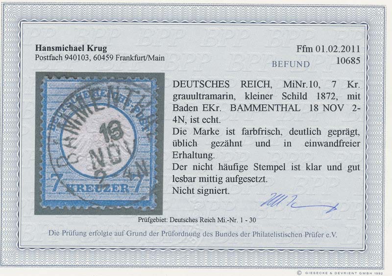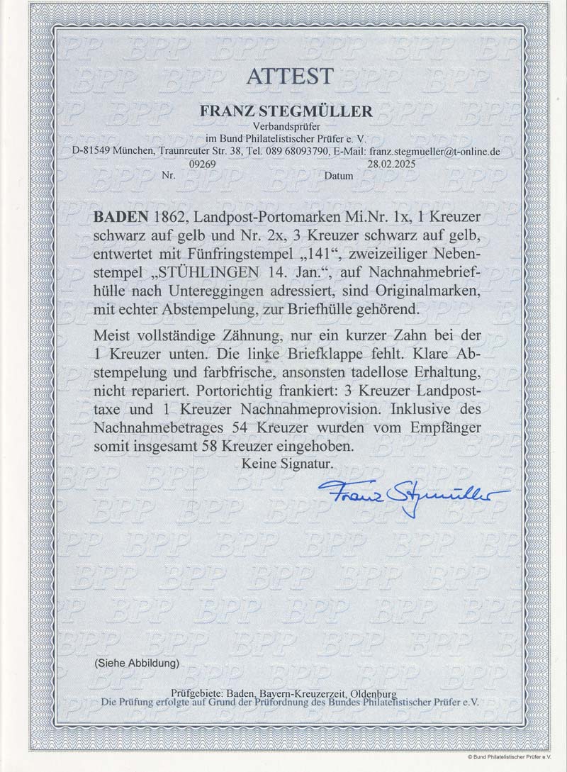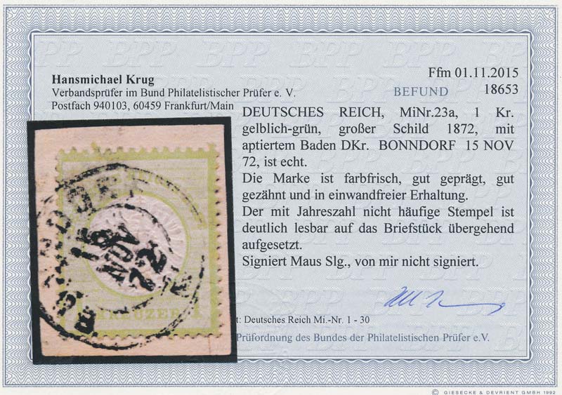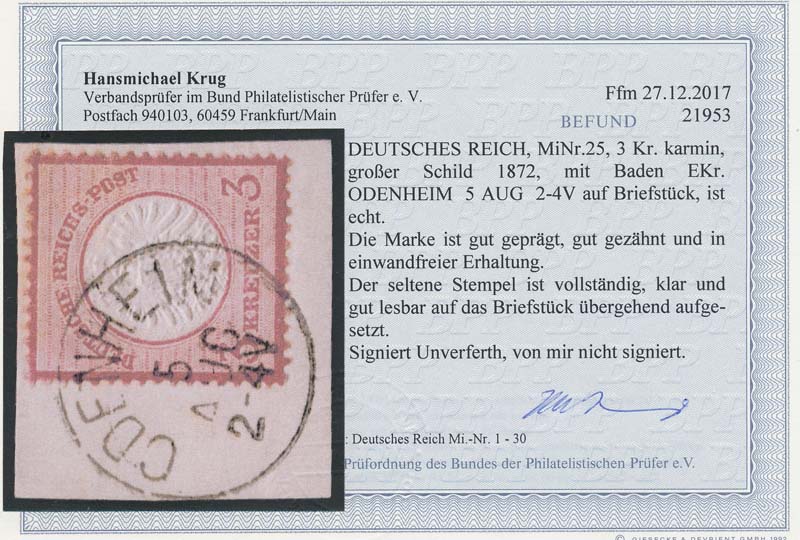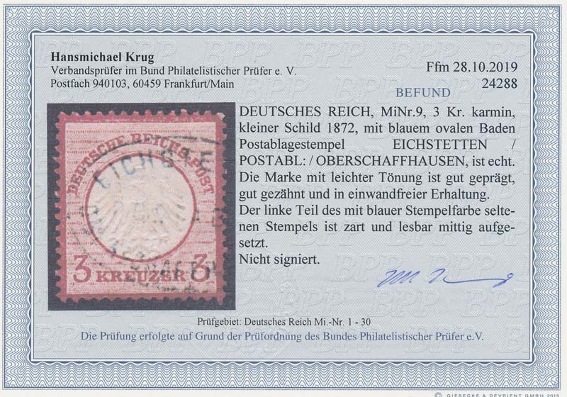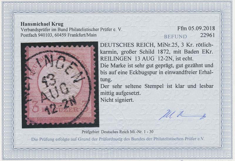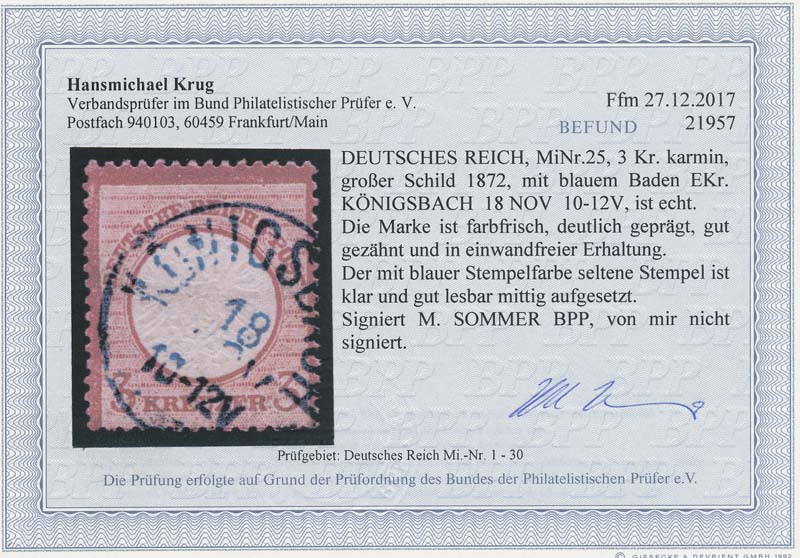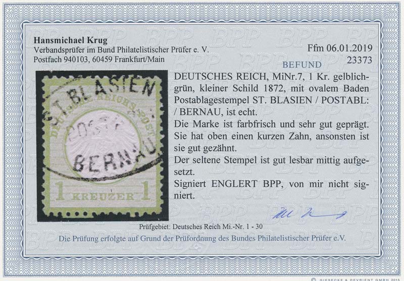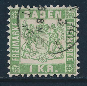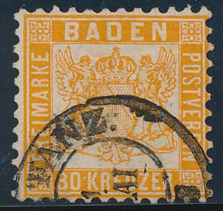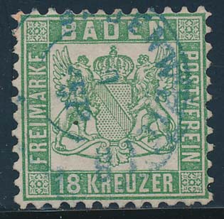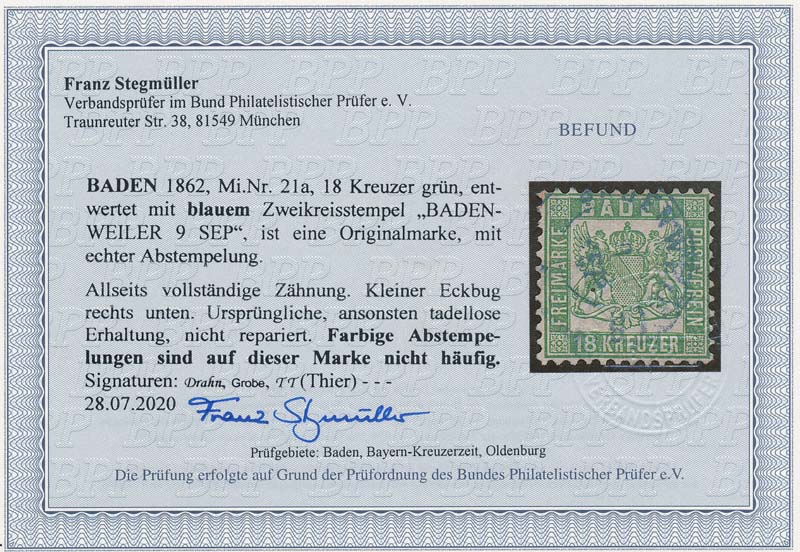 18 Kr. Wappen Ausg. 1862 "a"-Farbe mit blauen K2 "BADENWEILER" Befund Stegmüller "echt, allseits vollständige Zähnung, kl. Eckbug, ursprüngliche ansonsten tadellose Erhaltung, farbige Abstpl. sind auf dieser Marke nicht häufig!" |