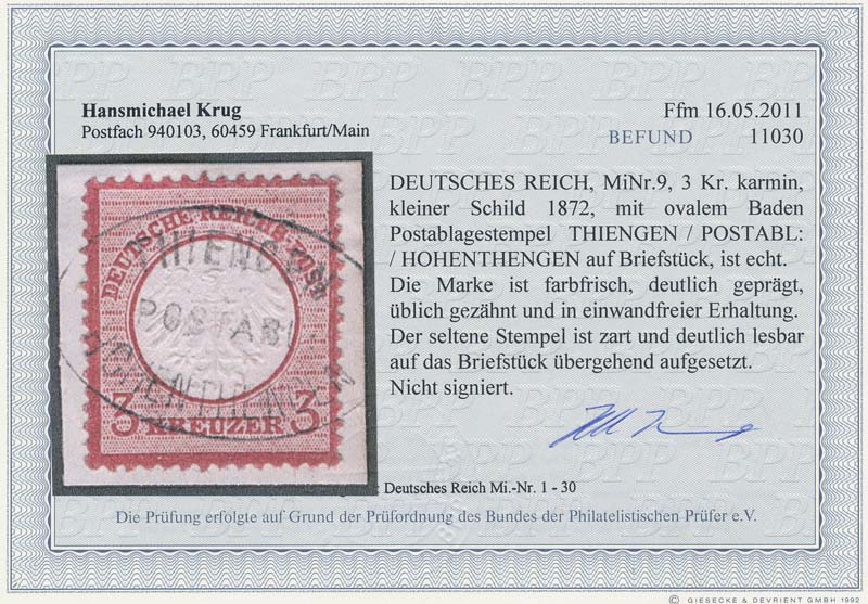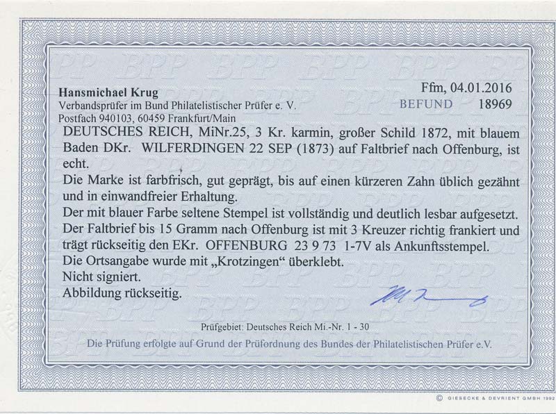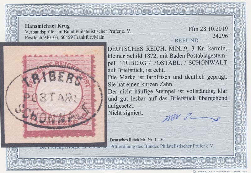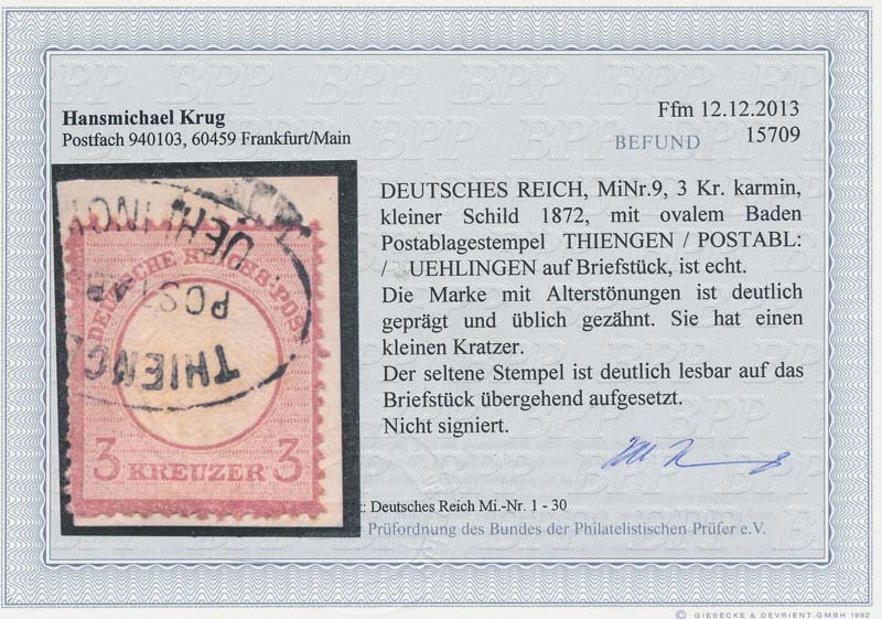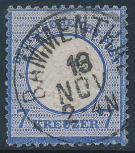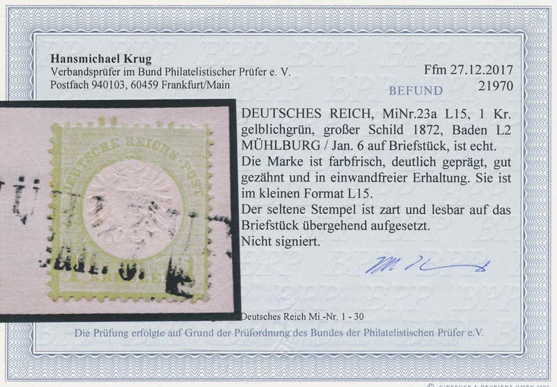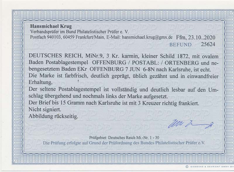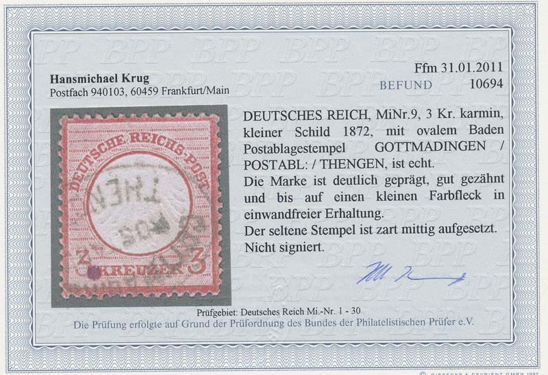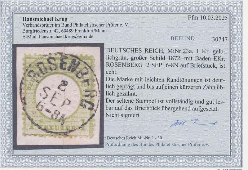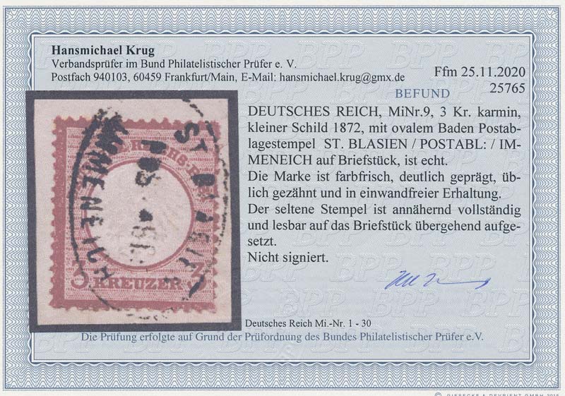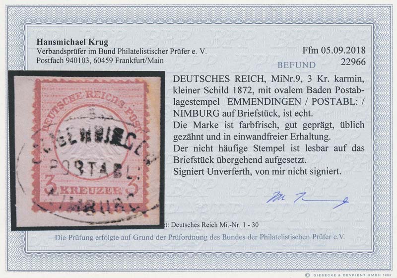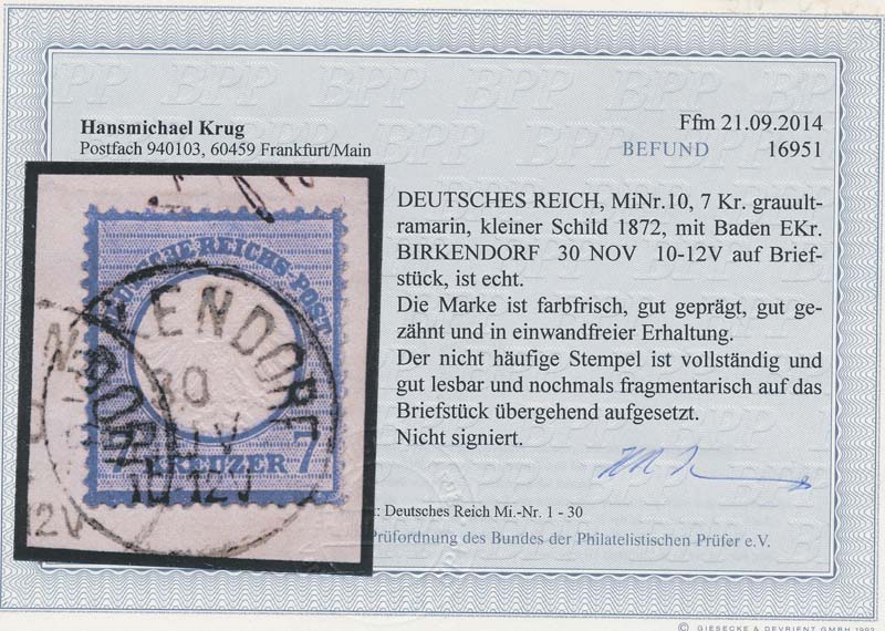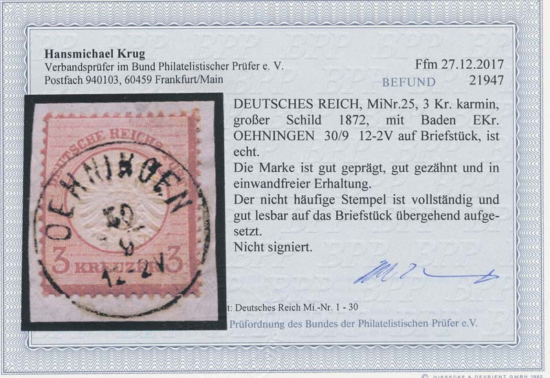 18 Kr. Wappen Ausg. 1862 "a"-Farbe mit blauen K2 "BADENWEILER" Befund Stegmüller "echt, allseits vollständige Zähnung, kl. Eckbug, ursprüngliche ansonsten tadellose Erhaltung, farbige Abstpl. sind auf dieser Marke nicht häufig!" |