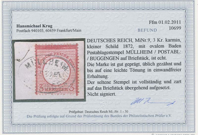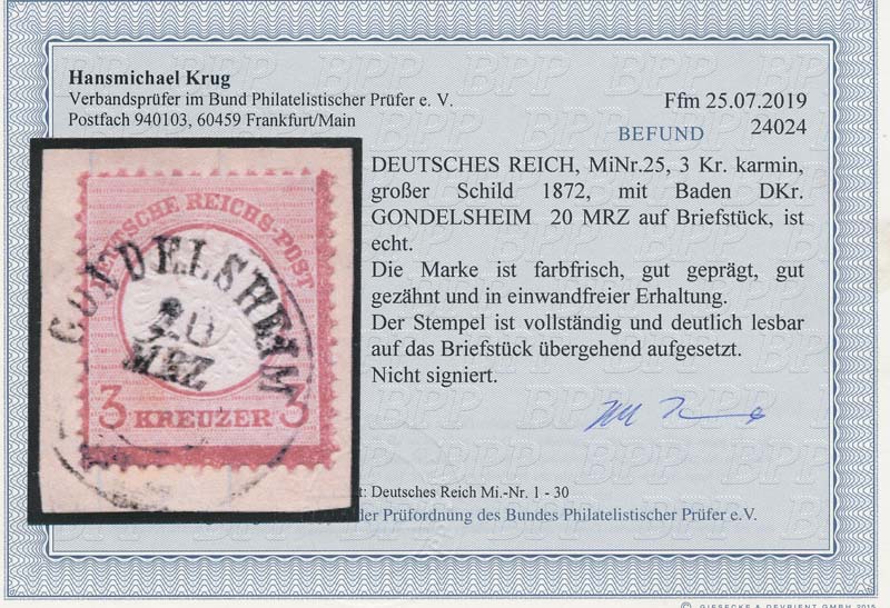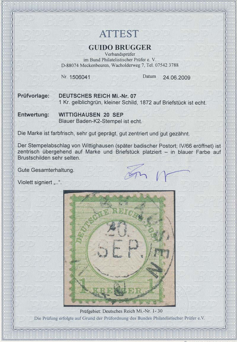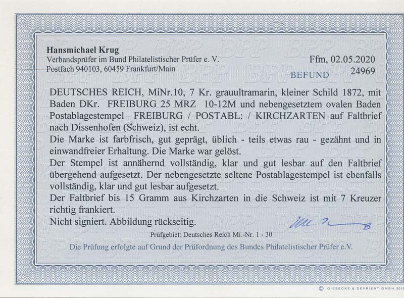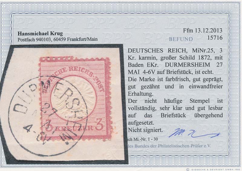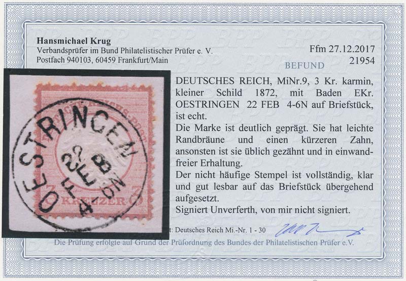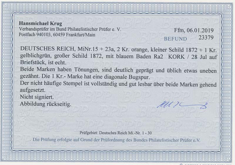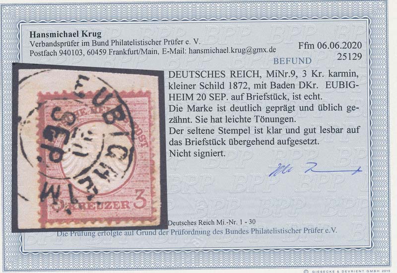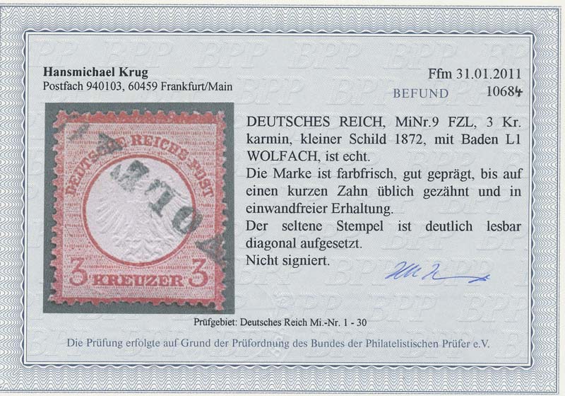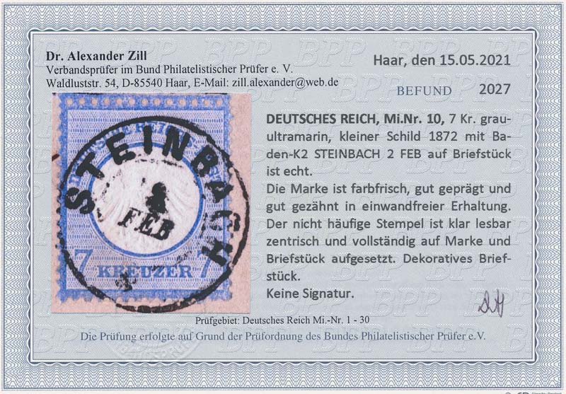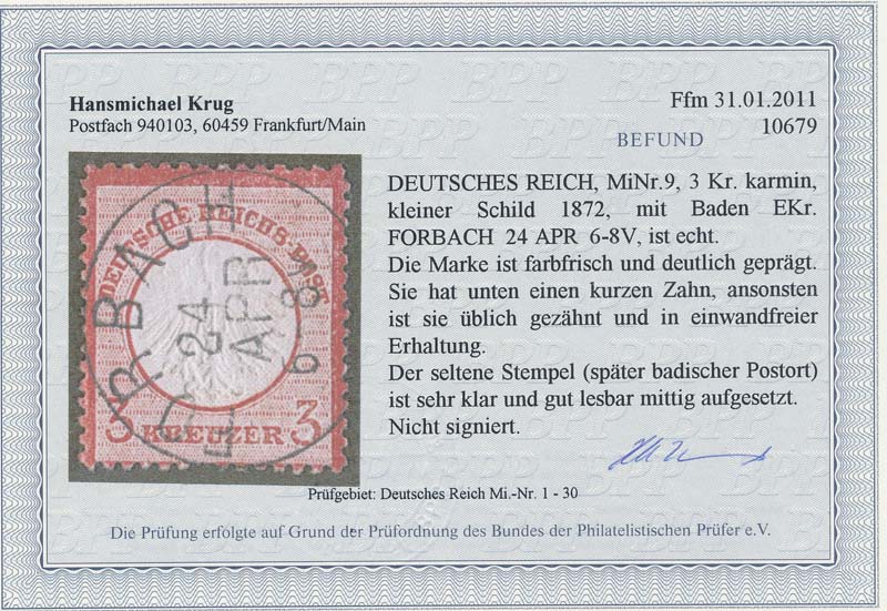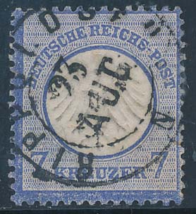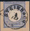 18 Kr. Wappen Ausg. 1862 "a"-Farbe mit blauen K2 "BADENWEILER" Befund Stegmüller "echt, allseits vollständige Zähnung, kl. Eckbug, ursprüngliche ansonsten tadellose Erhaltung, farbige Abstpl. sind auf dieser Marke nicht häufig!" |