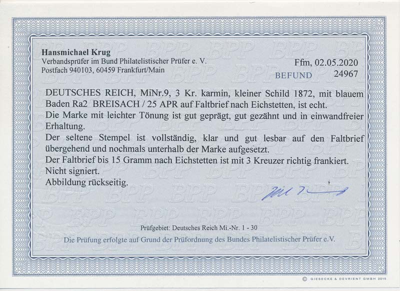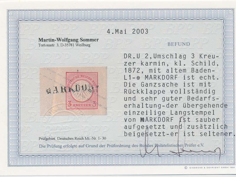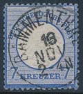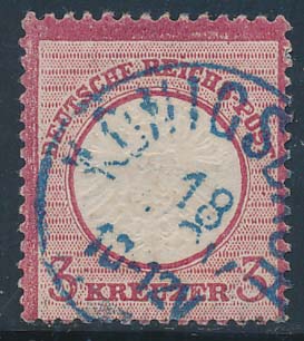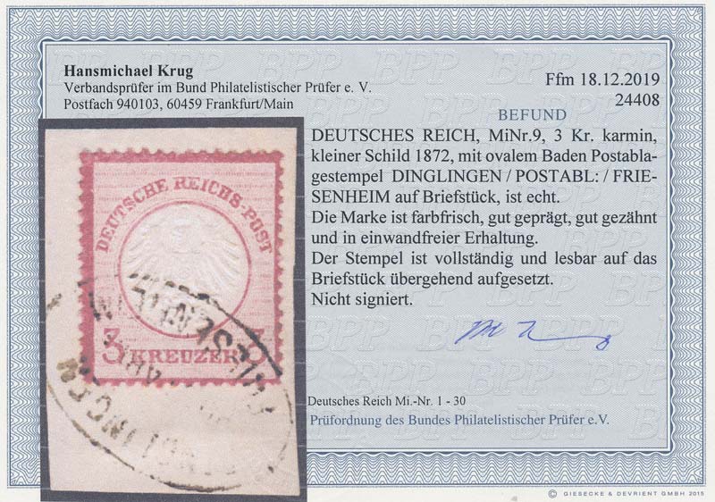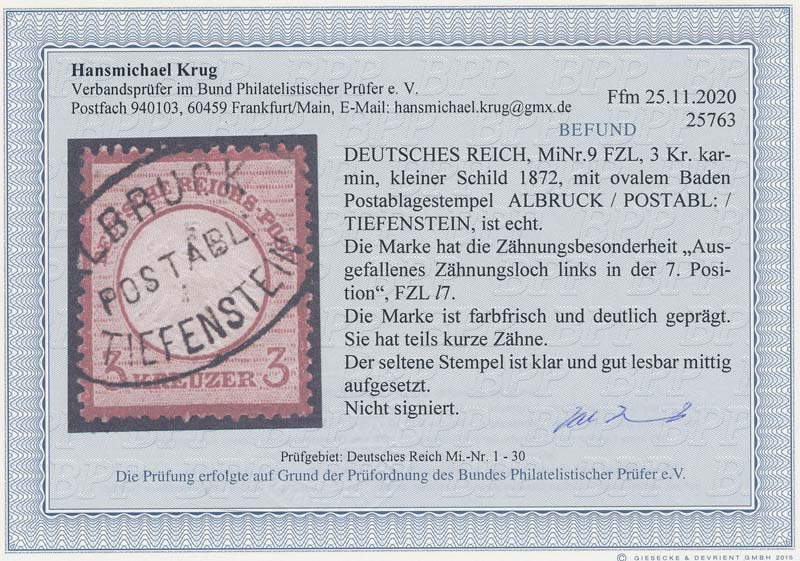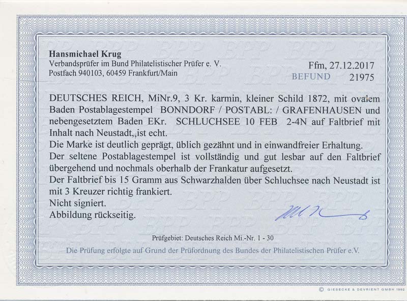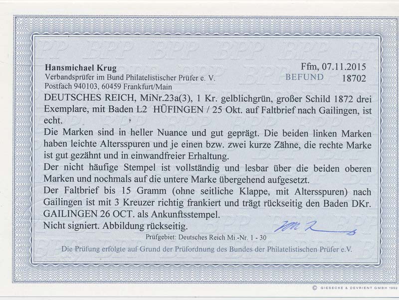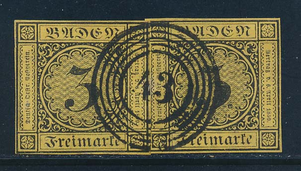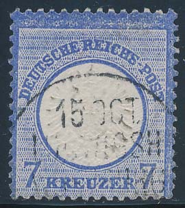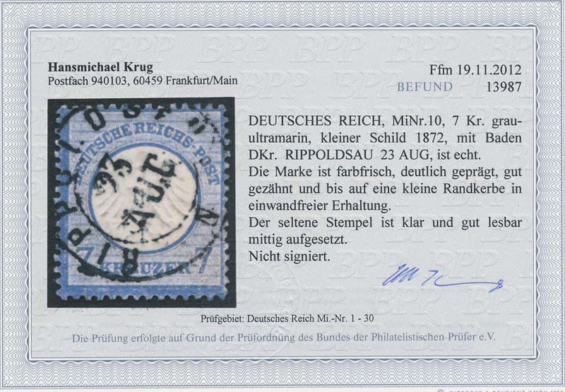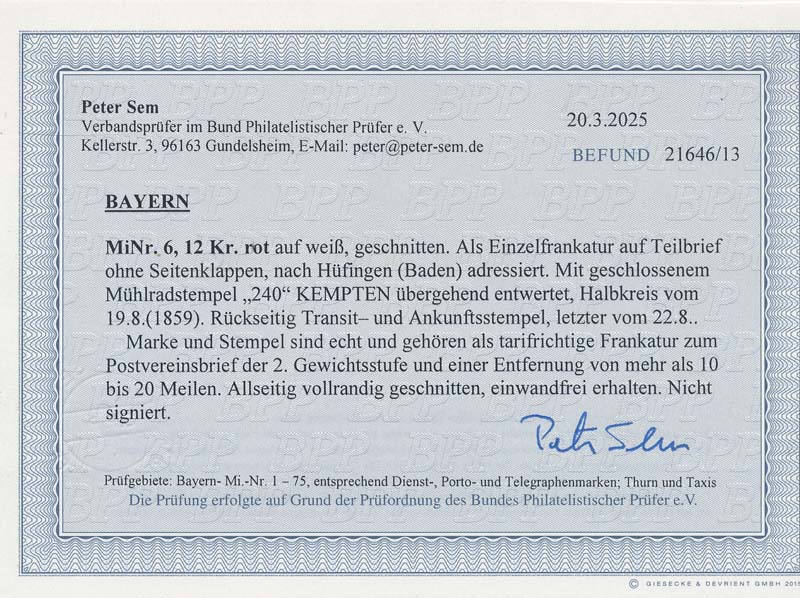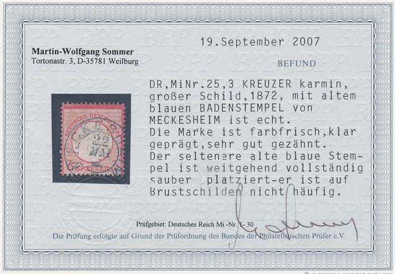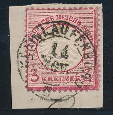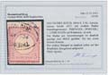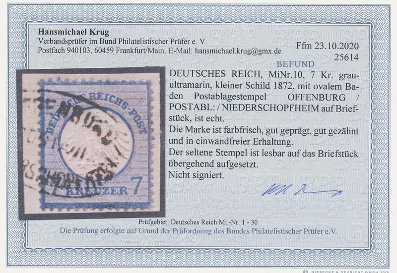 18 Kr. Wappen Ausg. 1862 "a"-Farbe mit blauen K2 "BADENWEILER" Befund Stegmüller "echt, allseits vollständige Zähnung, kl. Eckbug, ursprüngliche ansonsten tadellose Erhaltung, farbige Abstpl. sind auf dieser Marke nicht häufig!" |