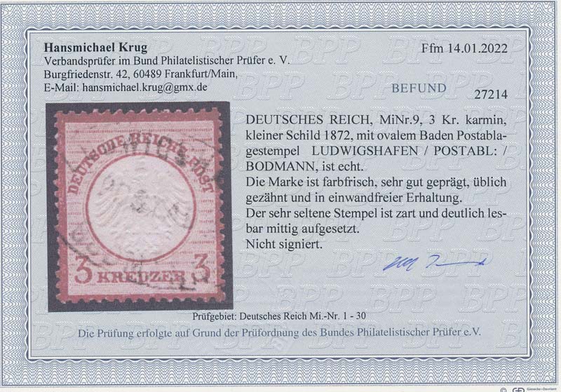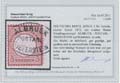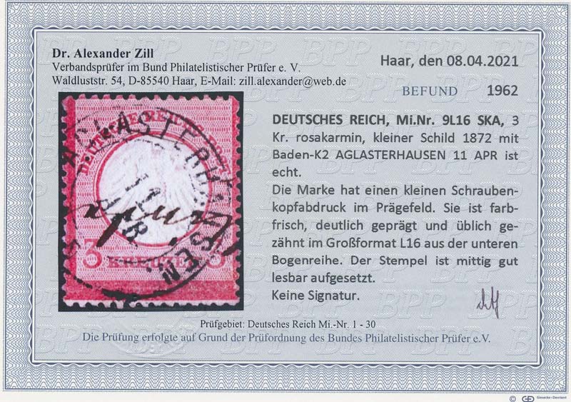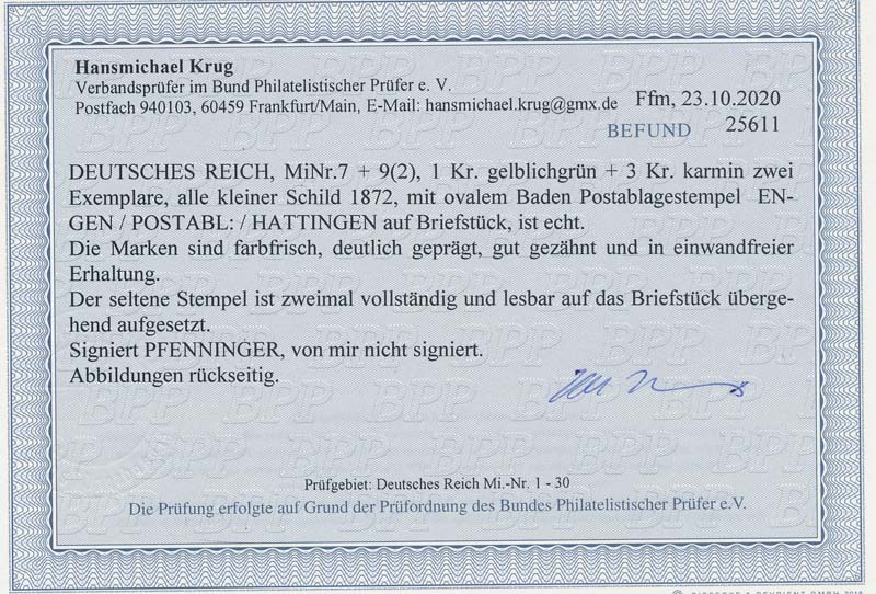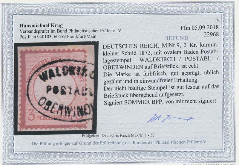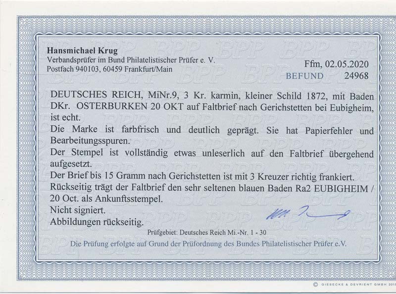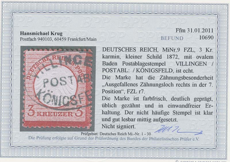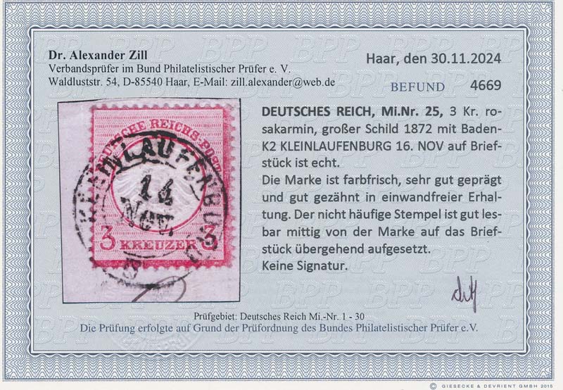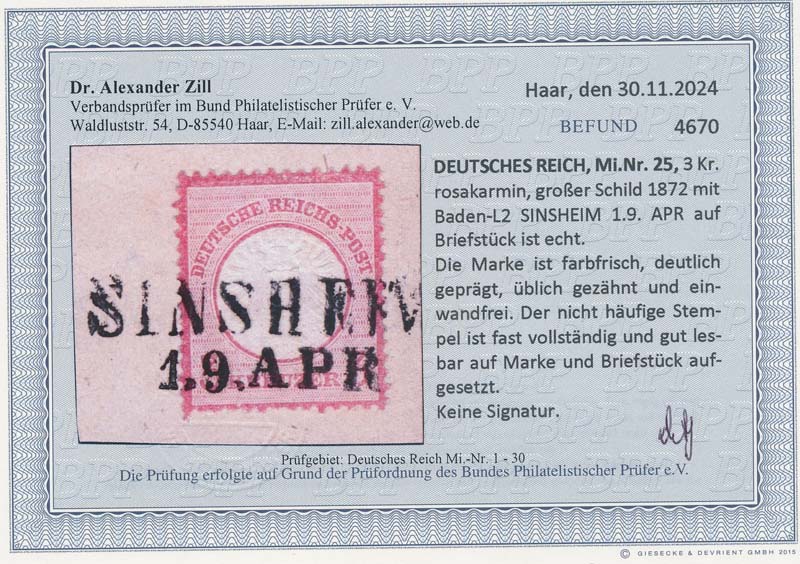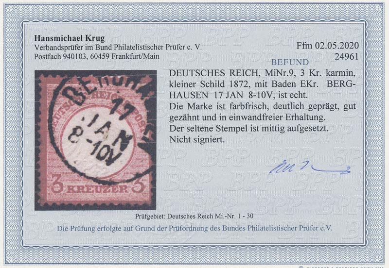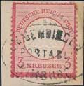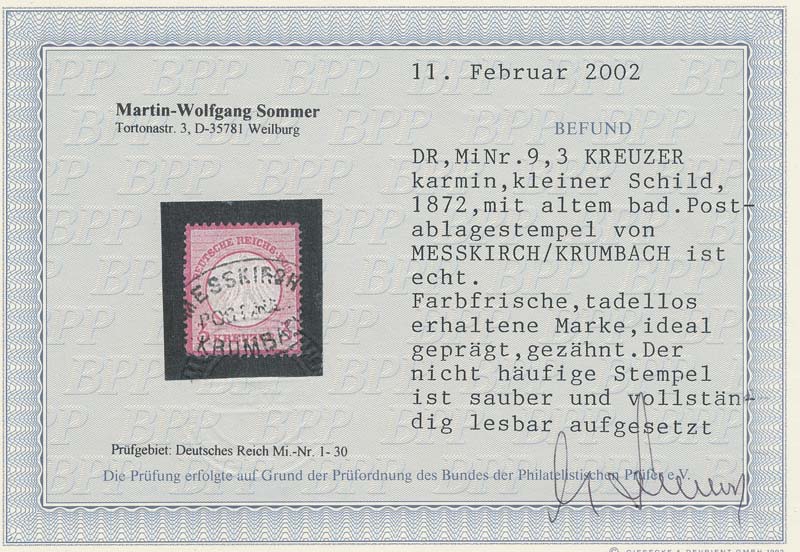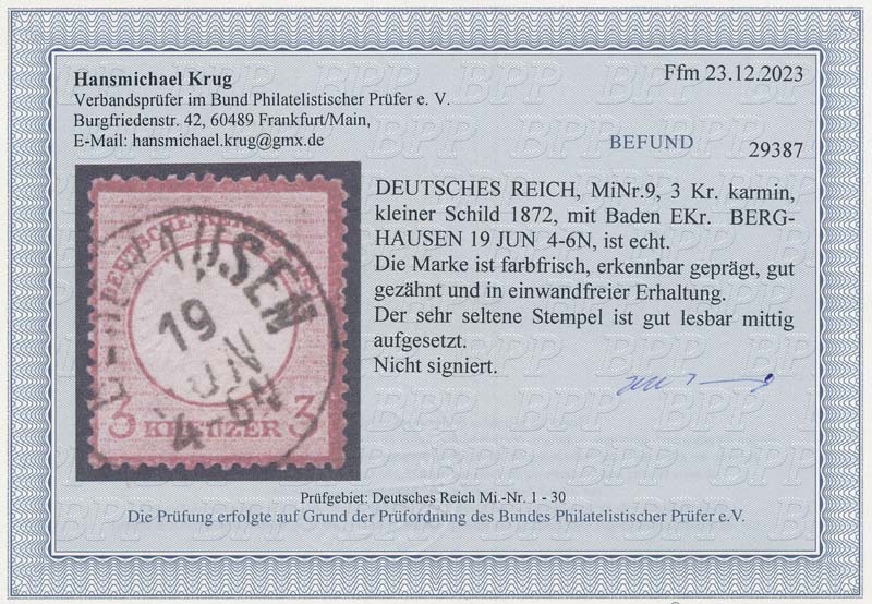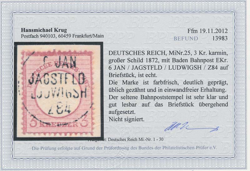 18 Kr. Wappen Ausg. 1862 "a"-Farbe mit blauen K2 "BADENWEILER" Befund Stegmüller "echt, allseits vollständige Zähnung, kl. Eckbug, ursprüngliche ansonsten tadellose Erhaltung, farbige Abstpl. sind auf dieser Marke nicht häufig!" |