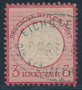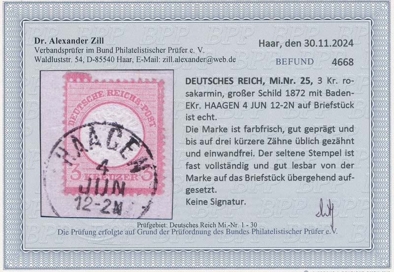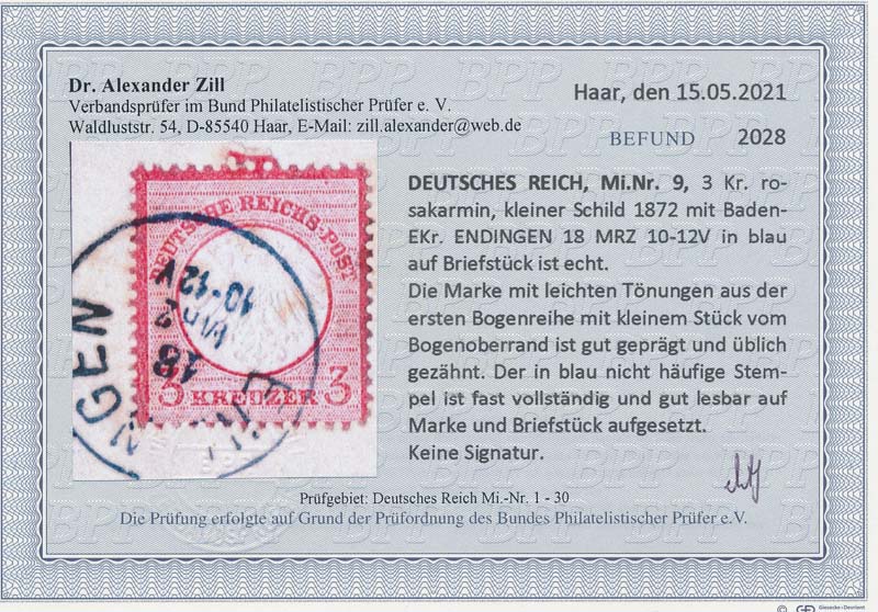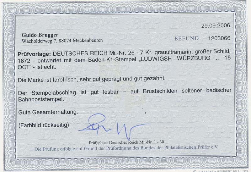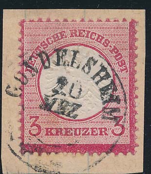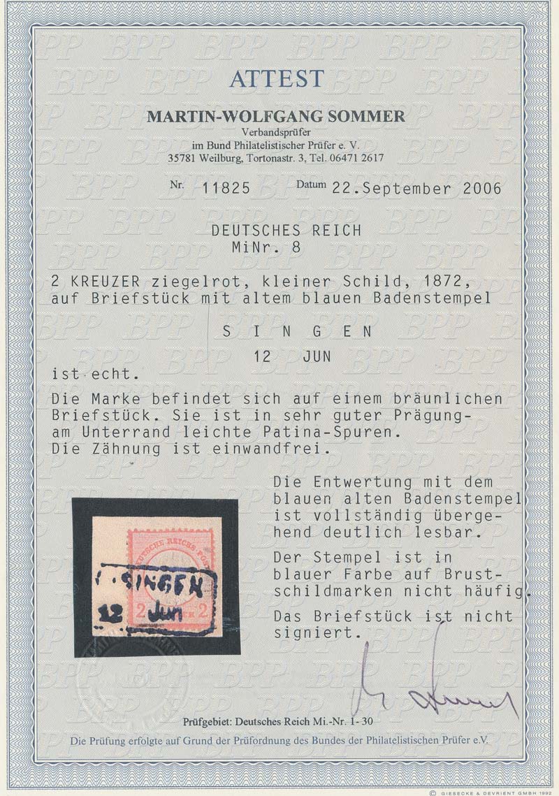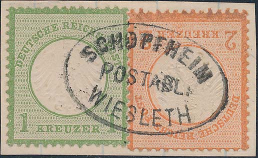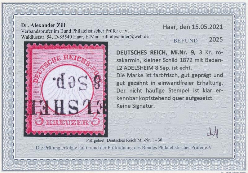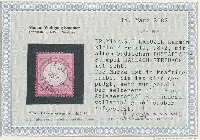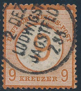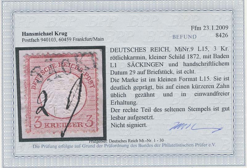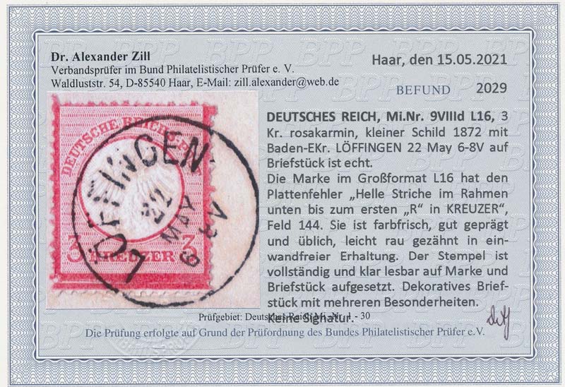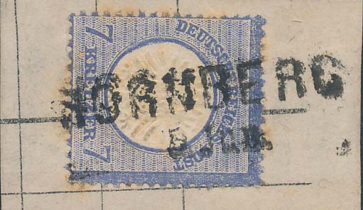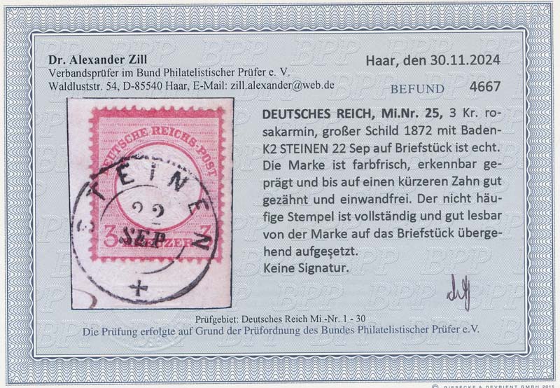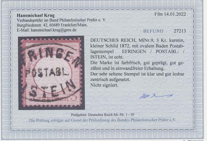 18 Kr. Wappen Ausg. 1862 "a"-Farbe mit blauen K2 "BADENWEILER" Befund Stegmüller "echt, allseits vollständige Zähnung, kl. Eckbug, ursprüngliche ansonsten tadellose Erhaltung, farbige Abstpl. sind auf dieser Marke nicht häufig!" |