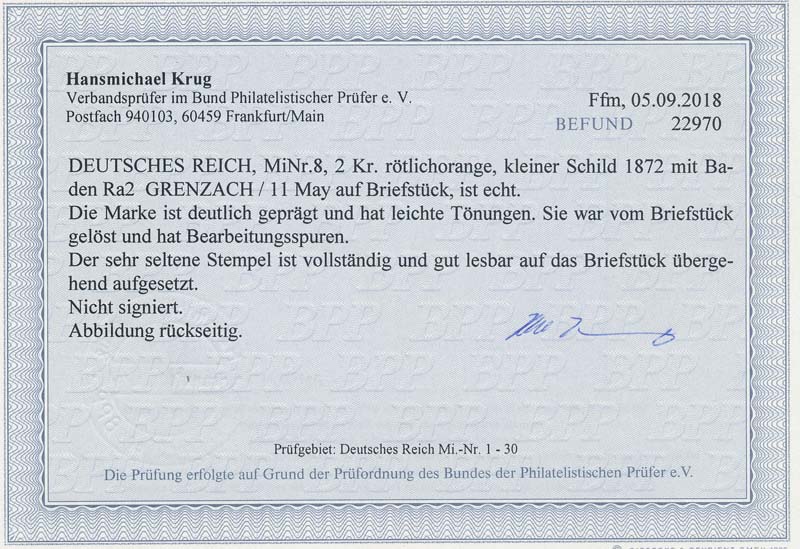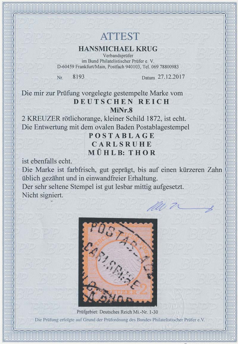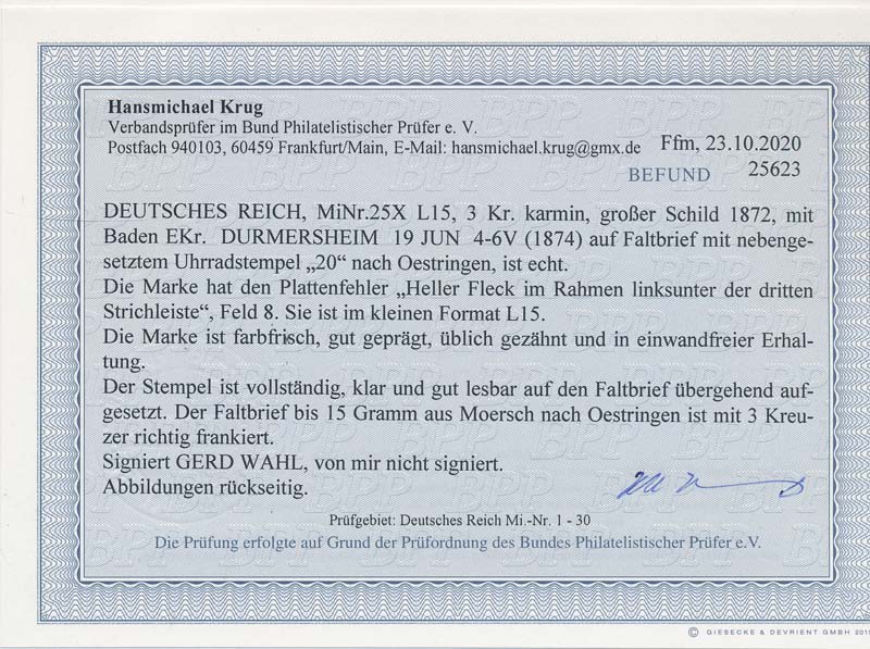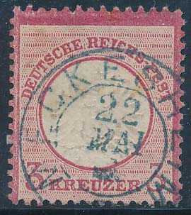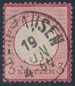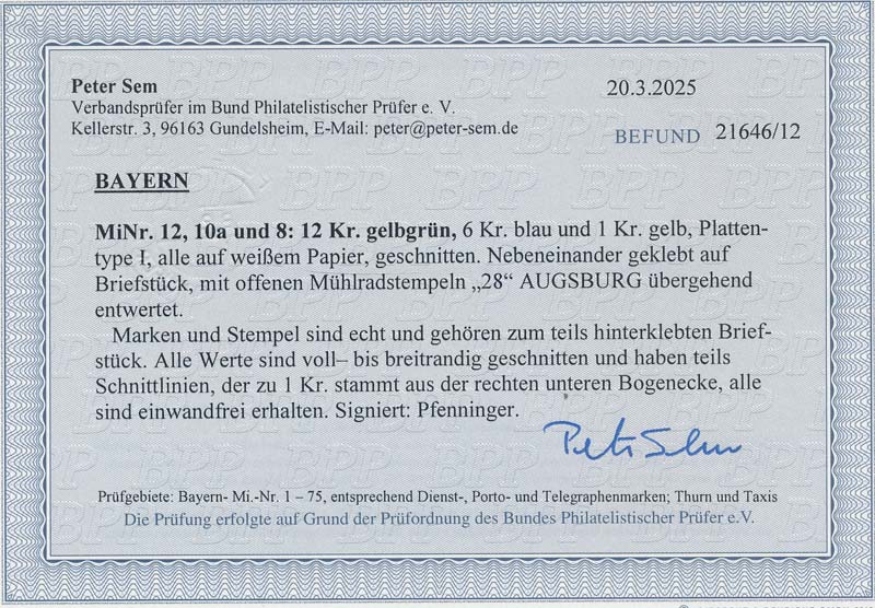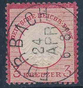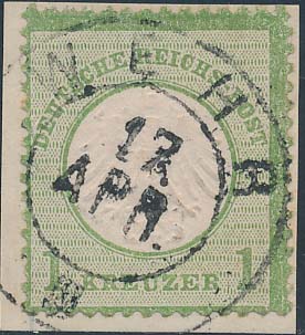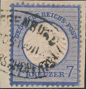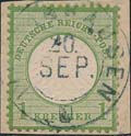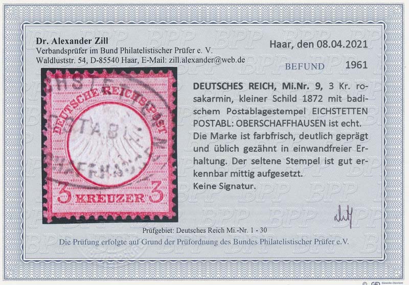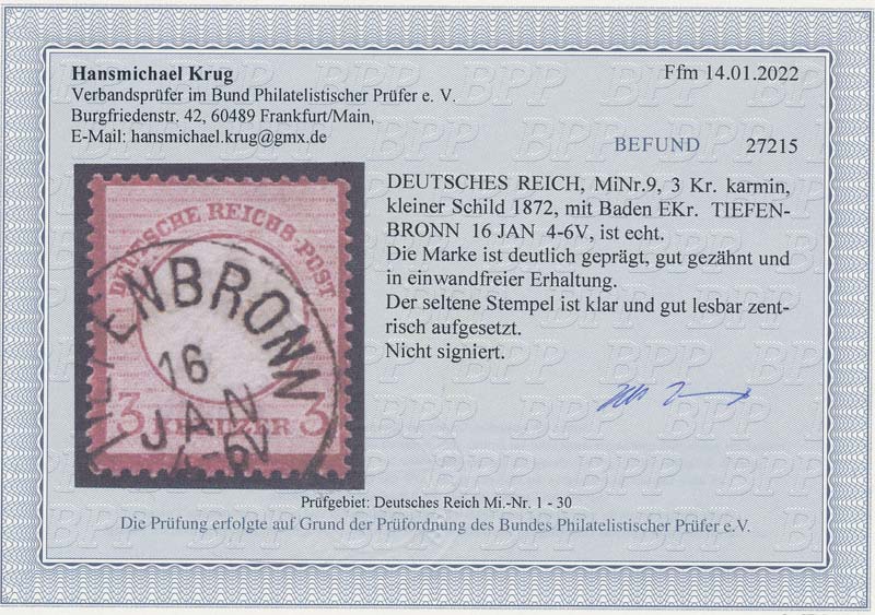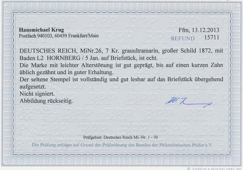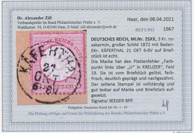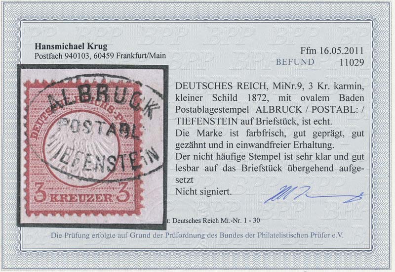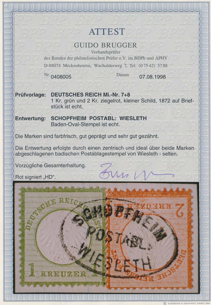 18 Kr. Wappen Ausg. 1862 "a"-Farbe mit blauen K2 "BADENWEILER" Befund Stegmüller "echt, allseits vollständige Zähnung, kl. Eckbug, ursprüngliche ansonsten tadellose Erhaltung, farbige Abstpl. sind auf dieser Marke nicht häufig!" |