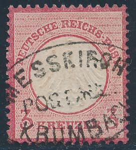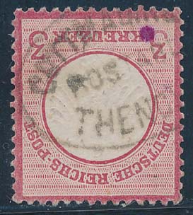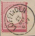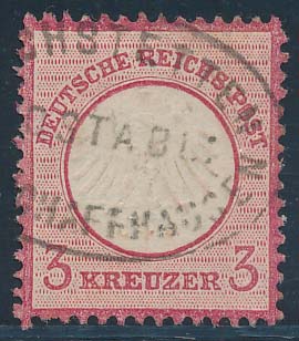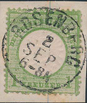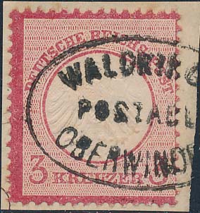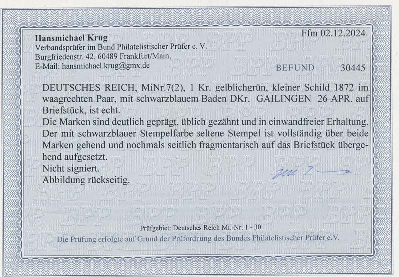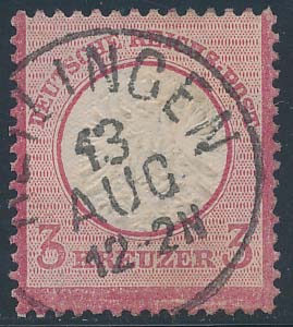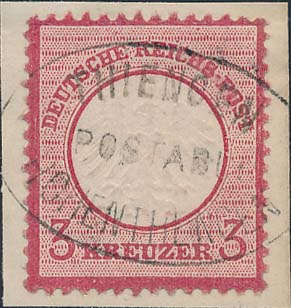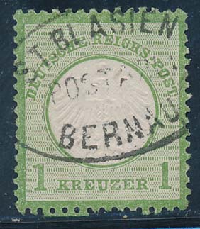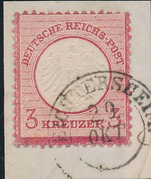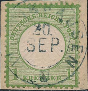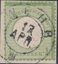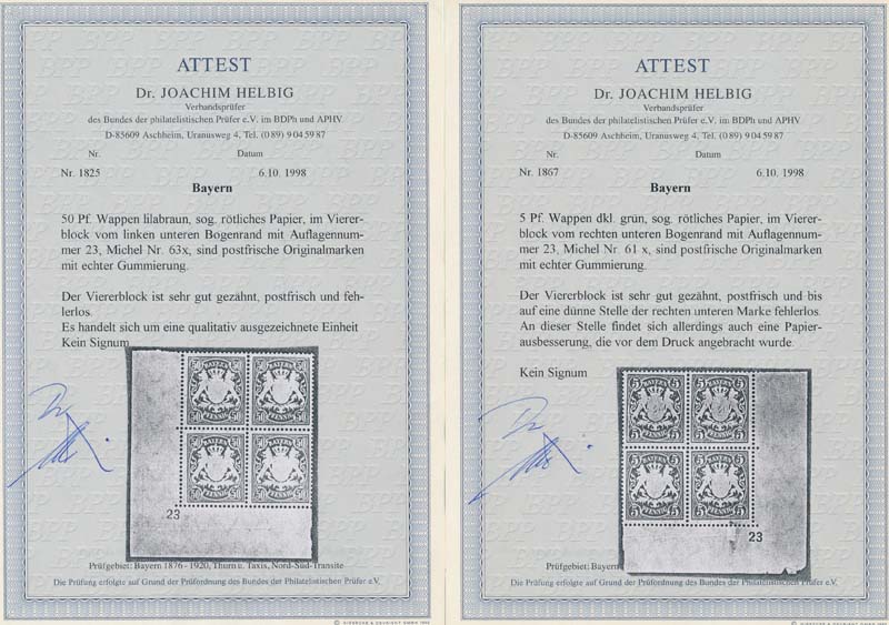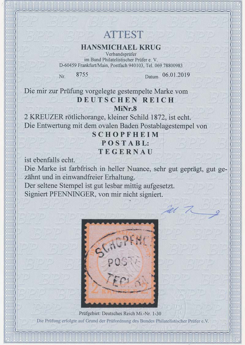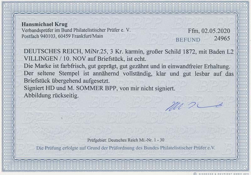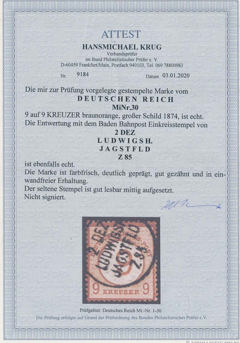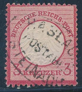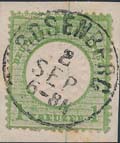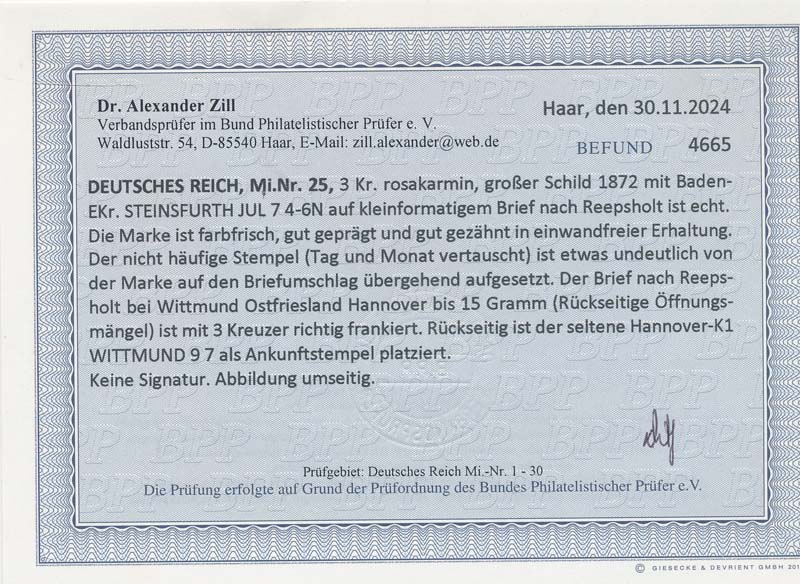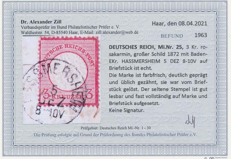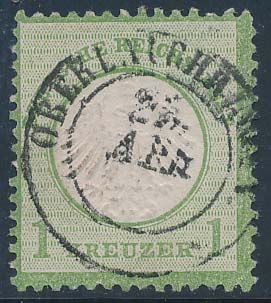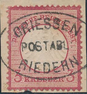 18 Kr. Wappen Ausg. 1862 "a"-Farbe mit blauen K2 "BADENWEILER" Befund Stegmüller "echt, allseits vollständige Zähnung, kl. Eckbug, ursprüngliche ansonsten tadellose Erhaltung, farbige Abstpl. sind auf dieser Marke nicht häufig!" |