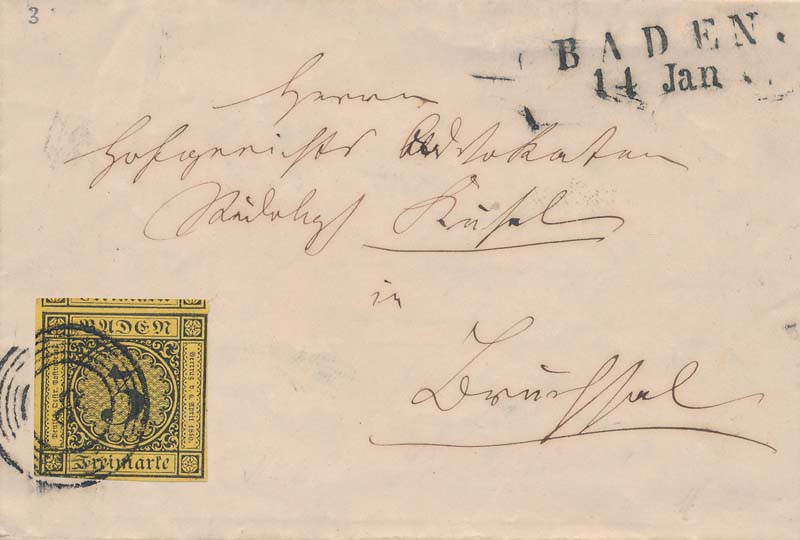 3 Kr. Ziffer Ausg. 1851 allseits voll bis überrandig als EF auf Bf. mit Nr.-Stpl. "8" u. nebenges. L2 "BADEN" tadellos! gepr. Stegmüller |