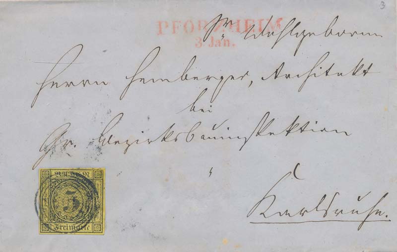 3 Kr. Ziffer Ausg. 1851 "b"-Farbe allseits breitrandig als EF auf Bf. mit Nr.-Stpl. "109" u. nebenges. roten L2 "PFORZHEIM" nach Carlsruhe. Bf.-Hülle ohne Seitenklappen sonst Pracht gepr. Stegmüller |