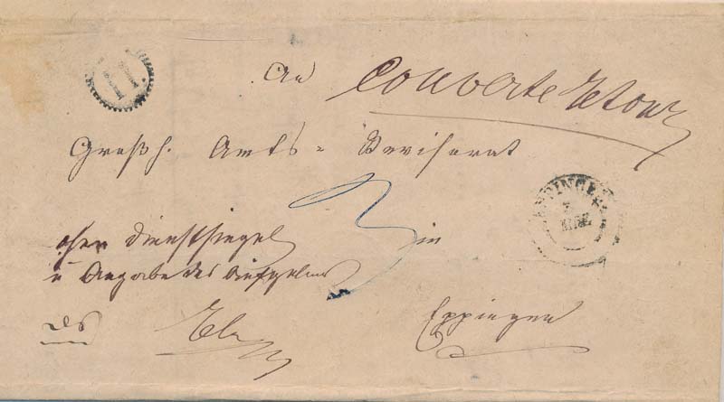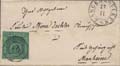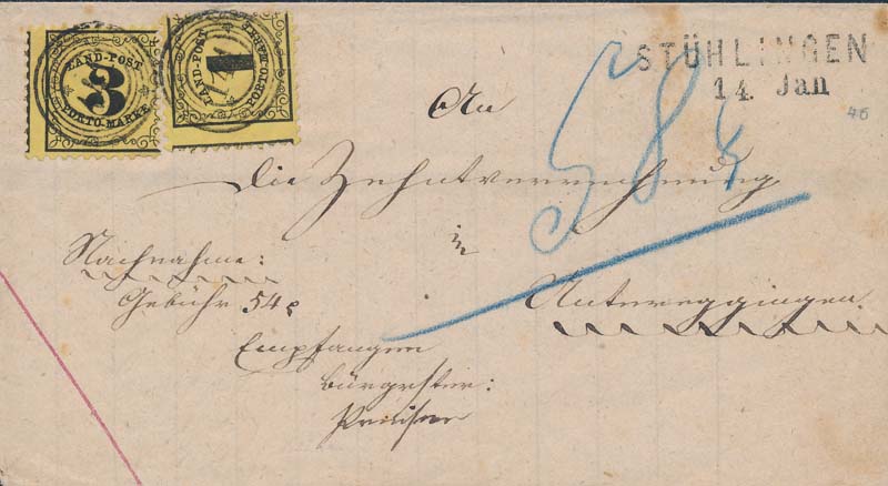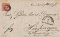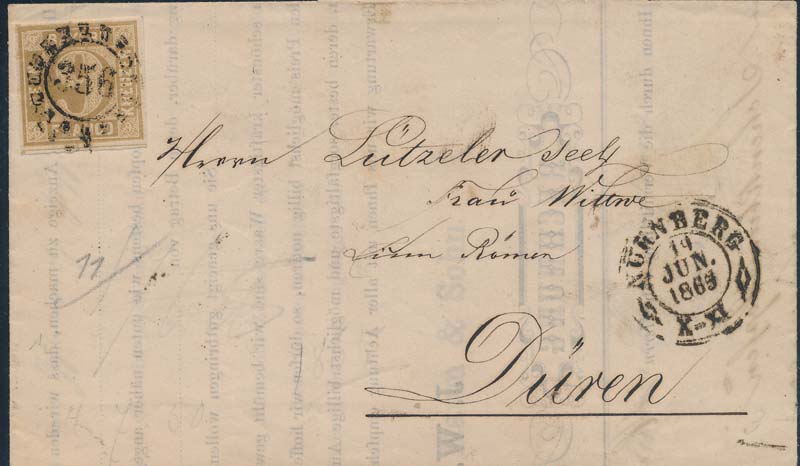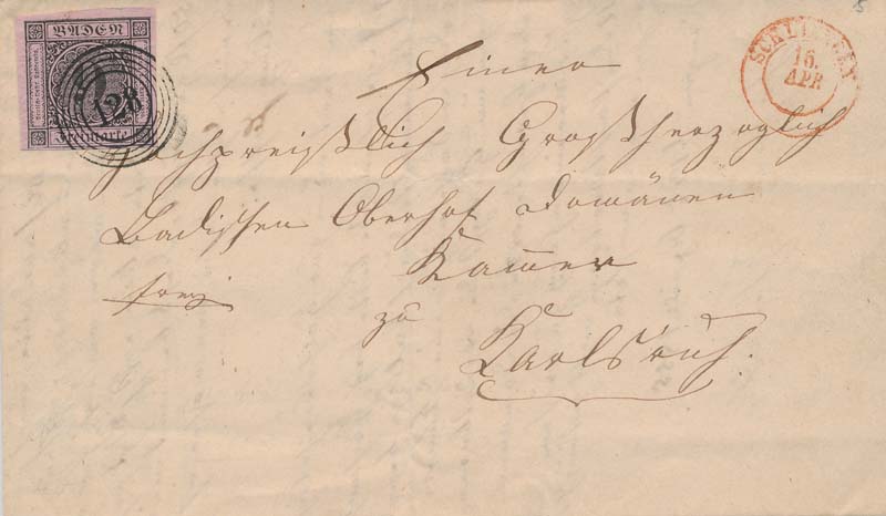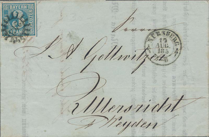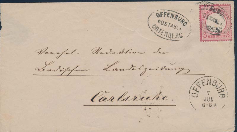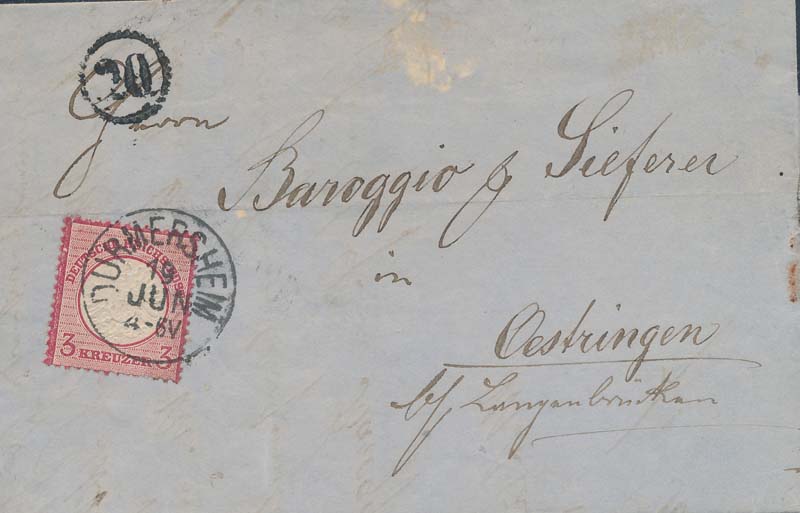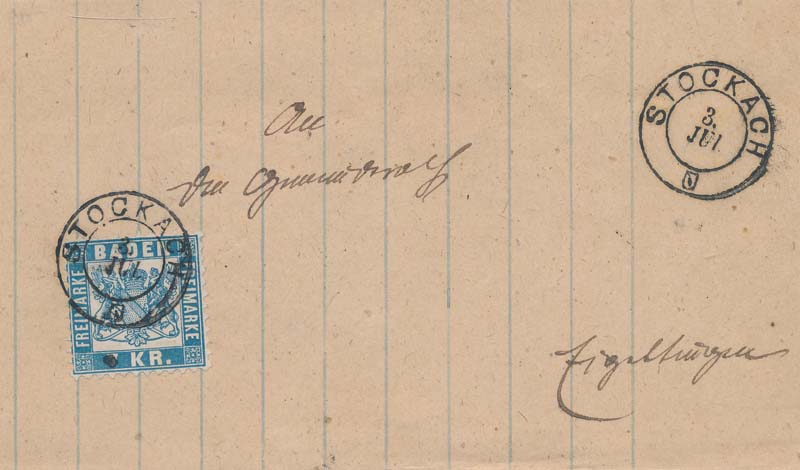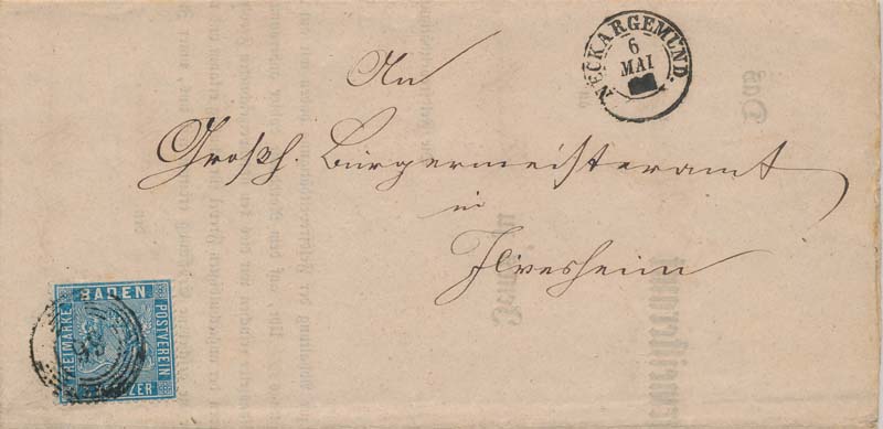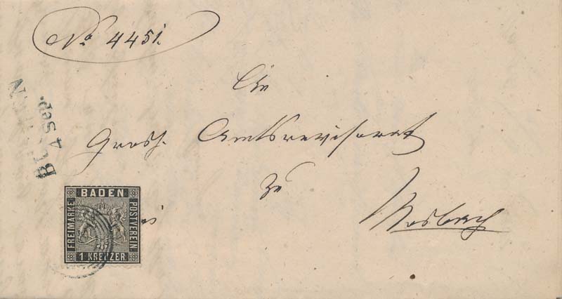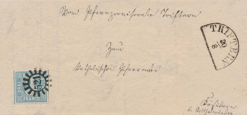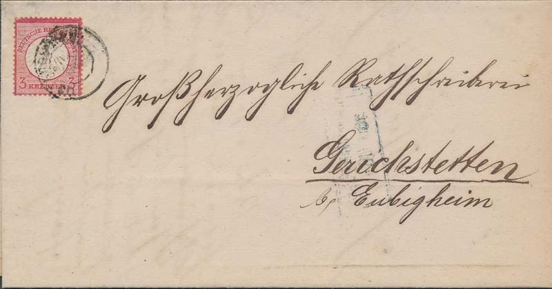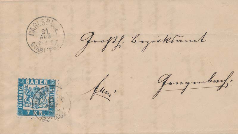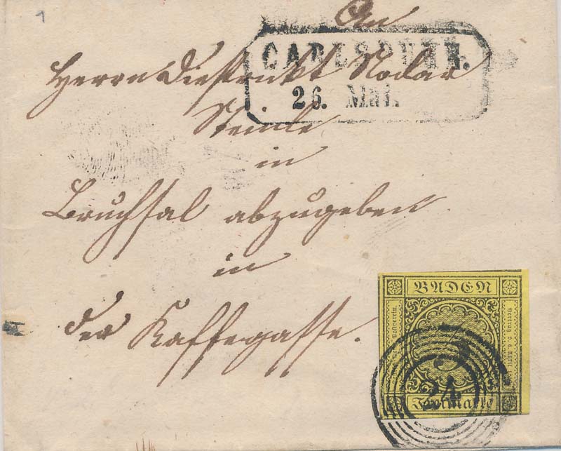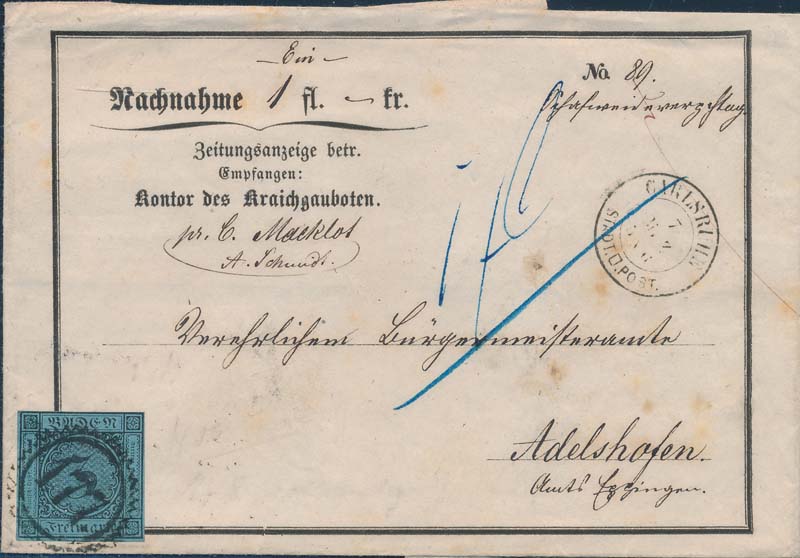 3 Kr. Ziffer Ausg. 1858 allseits vollrandig (oben Lupenrand) als EF auf NN-Bf. mit Zackenkranzstpl. "177" u. nebenges. K2 "CARLSRUHE STADTPOST" nach Adelshofen |
