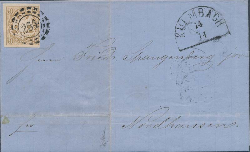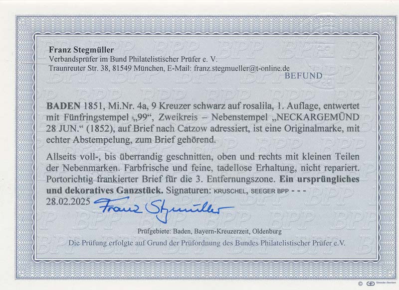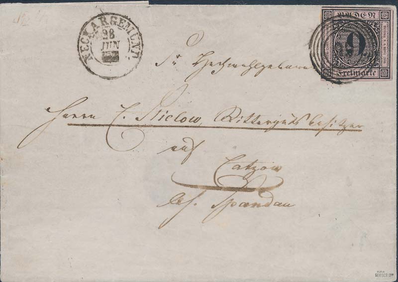 9 Kr. Ziffer Ausg. 1851 "a"-Farbe allseits voll bis überrandig als EF auf Bf. mit Nr.-Stpl. "99" u. nebenges. K2 "NECKARGEMÜND" nach Catzow. Neuer Befund Stegmüller "echt, farbfrische u. feine tadellose Erhaltung, ein ursprüngliches u. dek. Ganzstück!" |