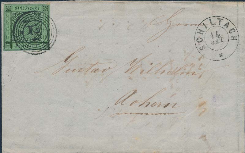 9 Kr. Ziffer Ausg. 1851 "b"-Farbe allseits breitrandig kl. l. obere Bogenecke! als EF auf Bf. mit Nr.-Stpl. "128" u. nebenges. roten K2 "SCHLIENGEN" nach Carlsruhe. Bf.-Hülle fehlen die Seitenklappen sonst tadellos! gepr. Stegmüller |
