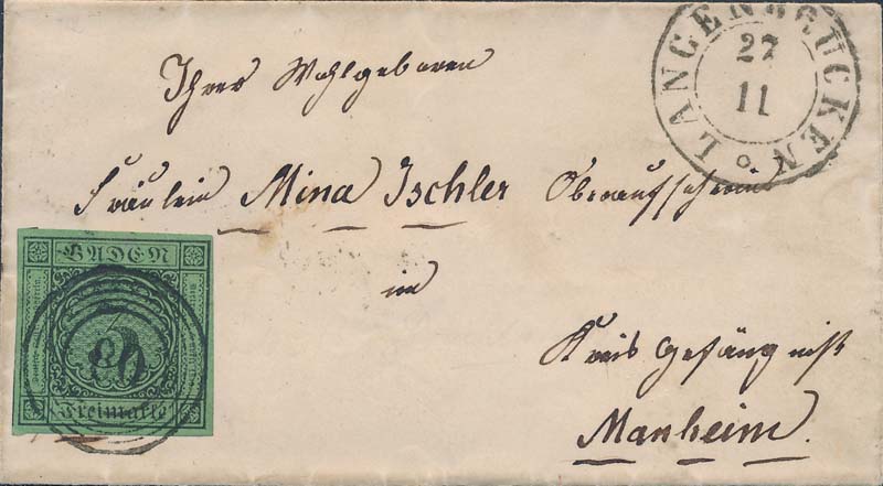 3 Kr. Ziffer Ausg. 1853 allseits breitrandig als EF auf Bf. mit Nr.-Stpl. "80" u. nebenges. K2 "LANGENBRÜCKEN" nach Mannheim tadellos! gepr. Stegmüller |