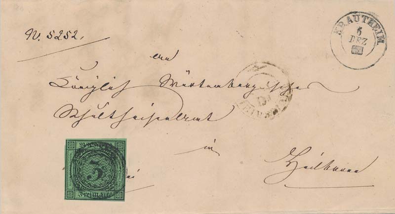 3 Kr. Ziffer Ausg. 1853 allseits voll bis breitrandig als EF auf Bf. mit Nr.-Stpl. "73" u. nebenges. K2 "KRAUTHEIM" nach Heilbronn, Bf.-Hülle ohne Seitenklappen sonst tadellos! gepr. Stegmüller |