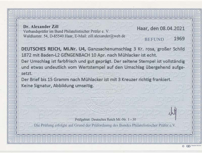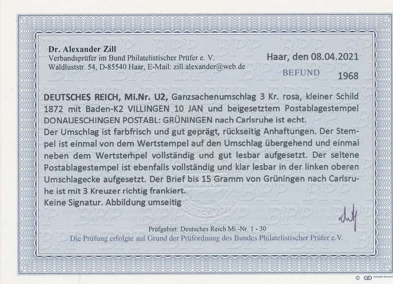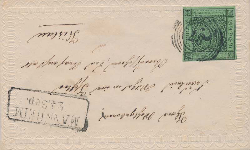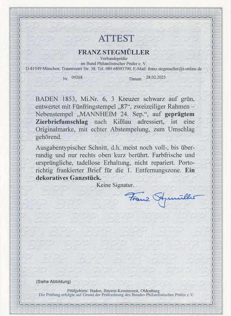 3 Kr. Ziffer Ausg. 1853 als EF auf vorder u. rücks. sehr dek. gedruckten Prägezierbf. mit Nr.-Stpl. "87" u. nebenges. Ra2 "MANNHEIM" nach Kißlau. Marke nur oben mini Randlinienschnitt sonst allseits voll bis breitrandig neues Fotoattest Stegmüller "echt, farbfrische u. ursprüngliche tadellose Erhaltung, ein dek. Ganzstück!" Ein Stück für die große Sammlung! |