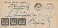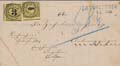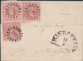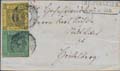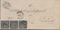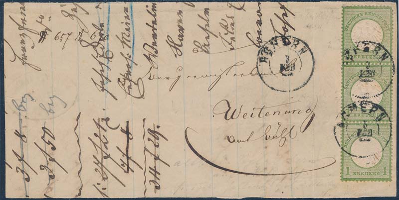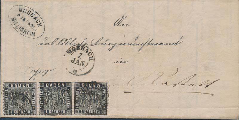 1 Kr. Wappen Ausg. 1862 als MeF von 3 St. (dabei ) auf Bf. ab Mosbach (K2) u. nebenges. Postablage "MOSBACH/BILLIGHEIM" nach Rastatt Umschlag doppelt verwendet innen als Dienstbf. ab Rastatt nach Mosbach |