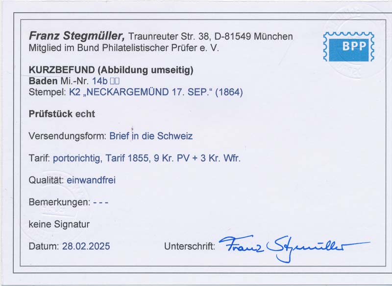 6 Kr. Wappen Ausg. 1860 "b"-Farbe im als MeF auf Auslandsbf. ab Neckargemünd (K2) vom 17.9.(64) in die Schweiz neuer Kurzbefund Stegmüller "echt u. einwandfrei" |