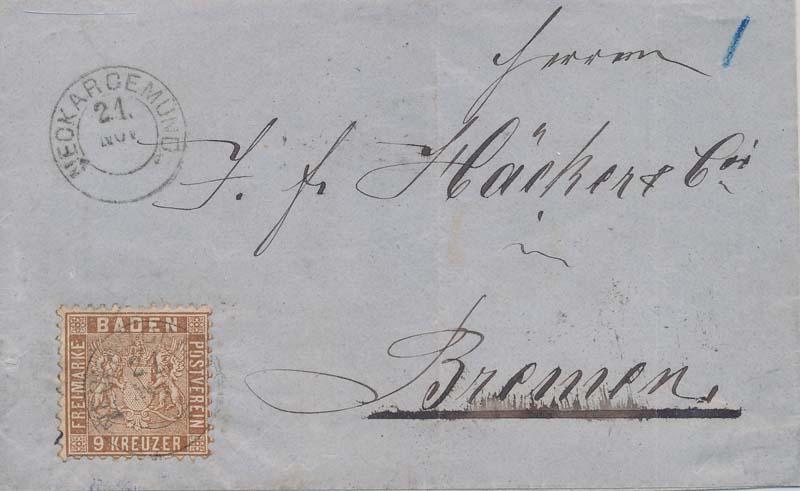 9 Kr. Wappen Ausg. 1862 "a"-Farbe als EF auf Bf. ab Neckargemünd (K2) nach Bremen tadellos! gepr. Stegmüller |