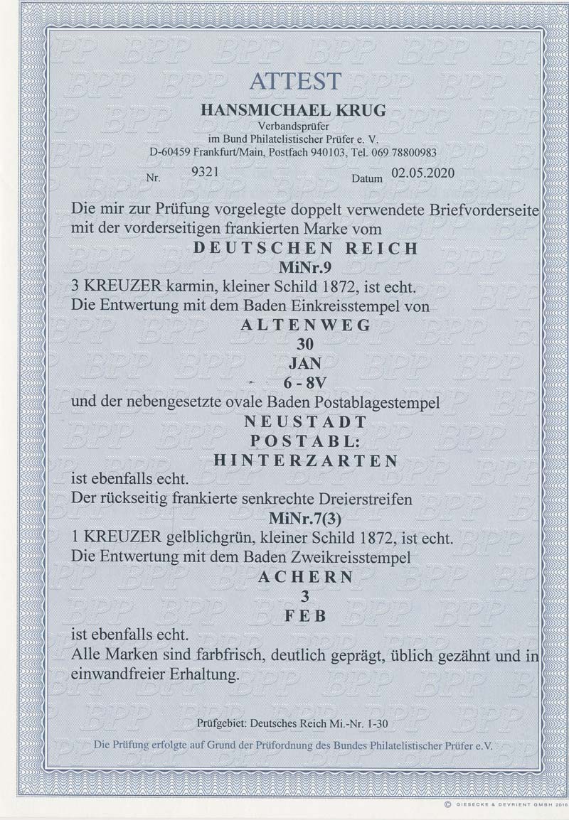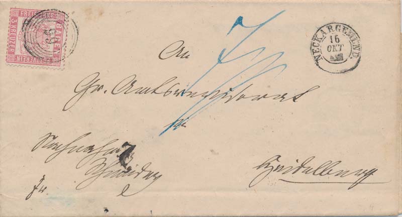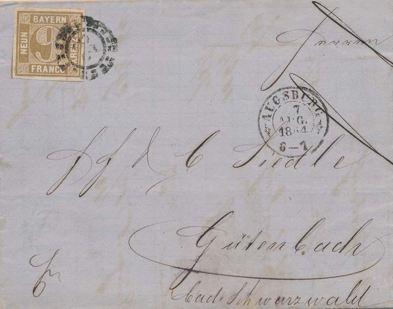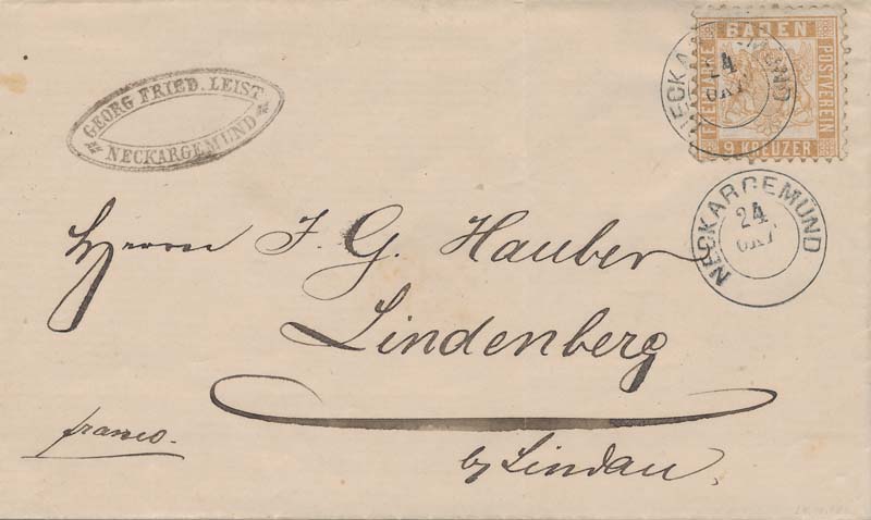 9 Kr. Wappen Ausg. 1862 "ba"-Farbe als EF auf Bf. ab Neckargemünd (K2) nach Lindenberg tadellos! gepr. Stegmüller |