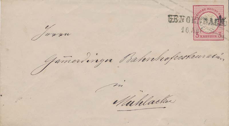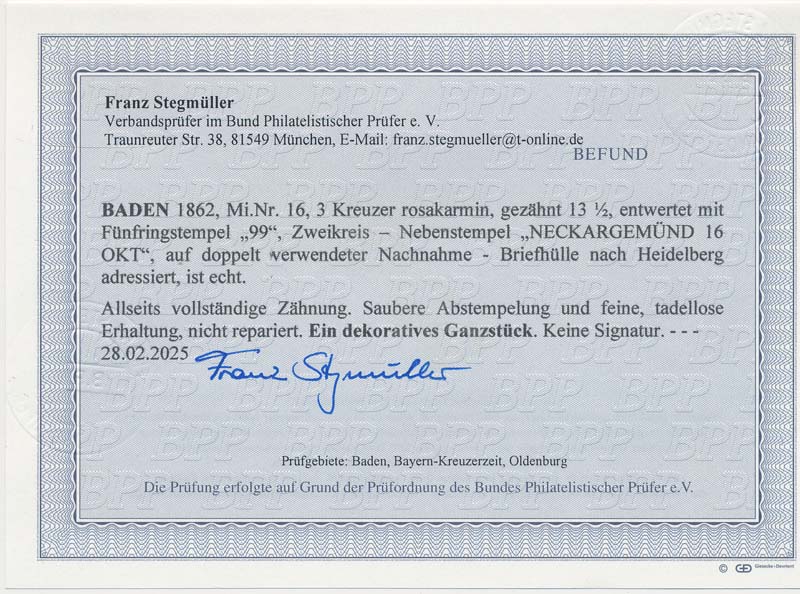 3 Kr. Wappen Ausg. 1862 eng gez. als EF auf doppelt verwendeten NN-Bf.-Hülle mit Nr.-Stpl. "99" u. nebenges. K2 "NECKARGEMÜND" nach Heidelberg. Neuer Befund Stegmüller "echt, vollständige Zähnung u. einwandfrei, ein dek. Ganzstück!" |