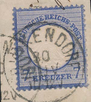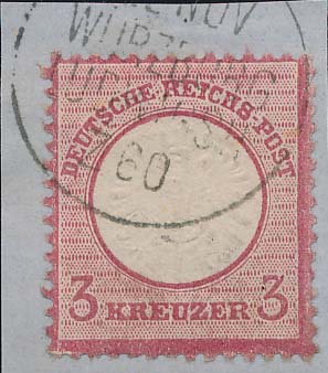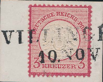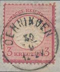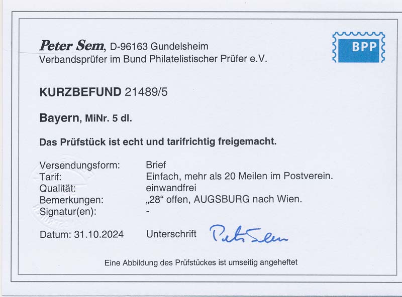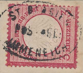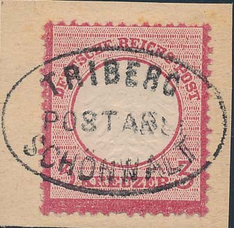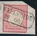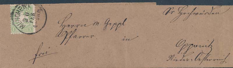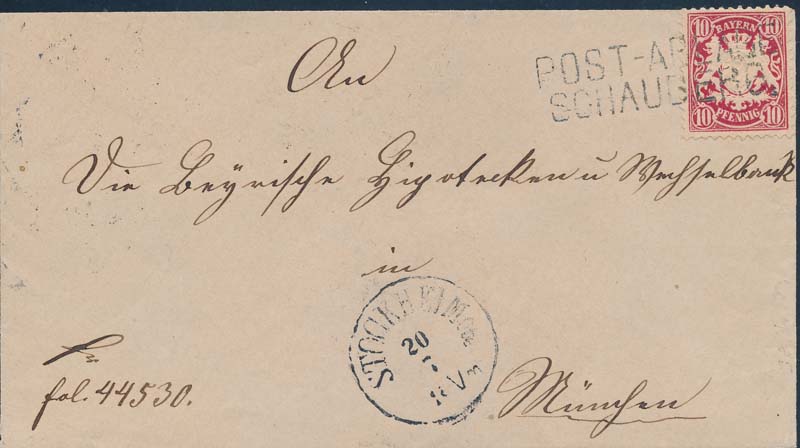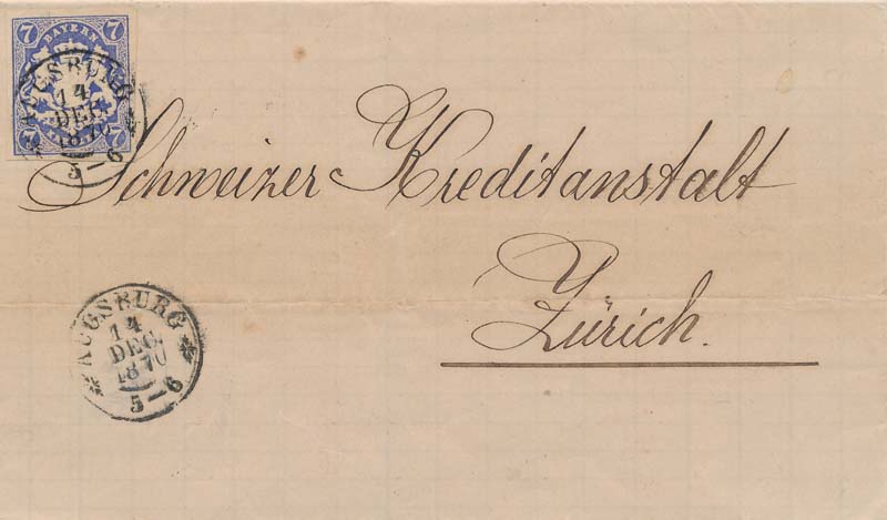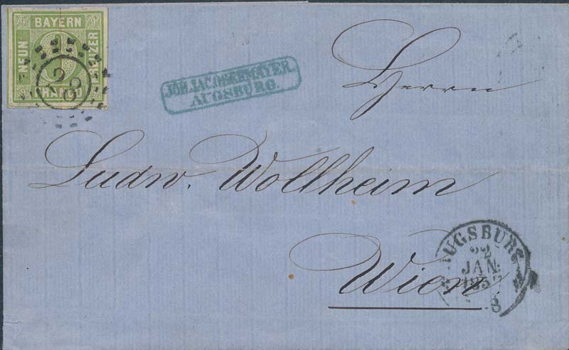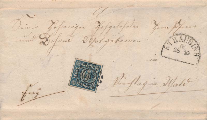 "472" zentrisch glasklar auf Bf. mit voll bis breitrandiger 3 Kr. Ziffer blau u. nebenges. HKS "SCHROBENHAUSEN" nach Augsburg |