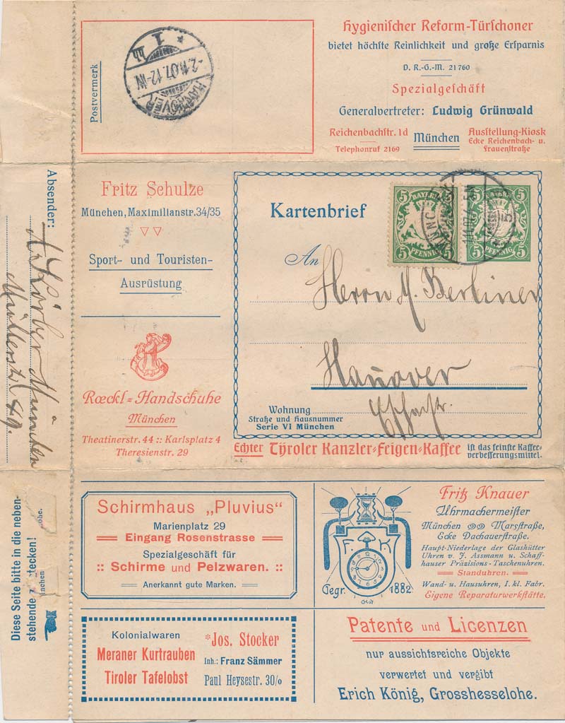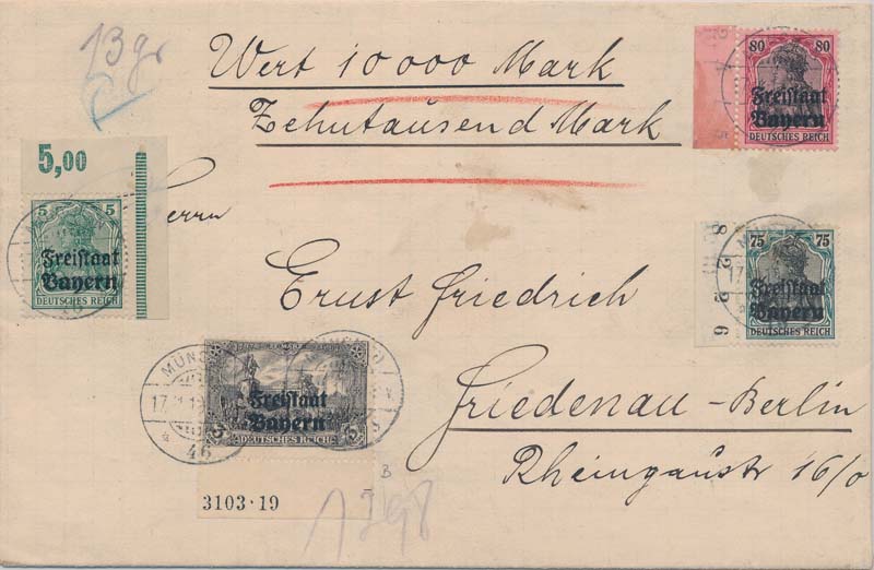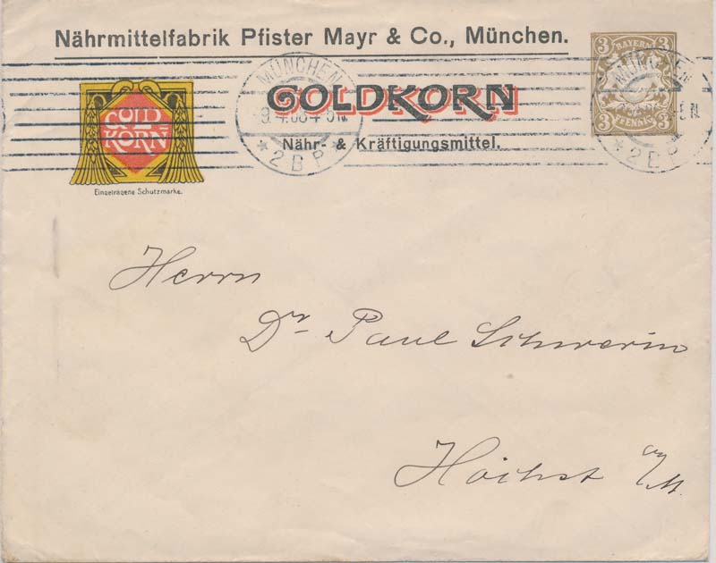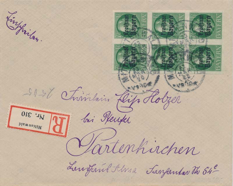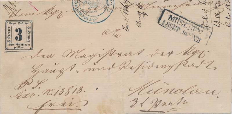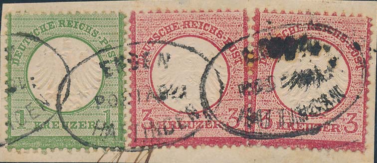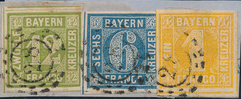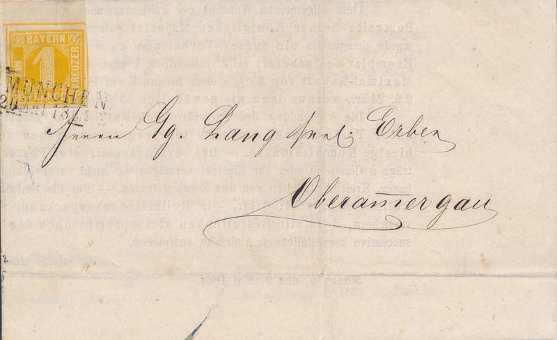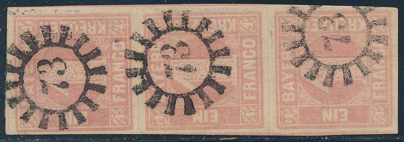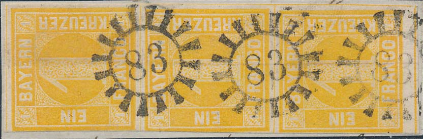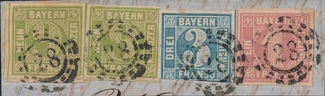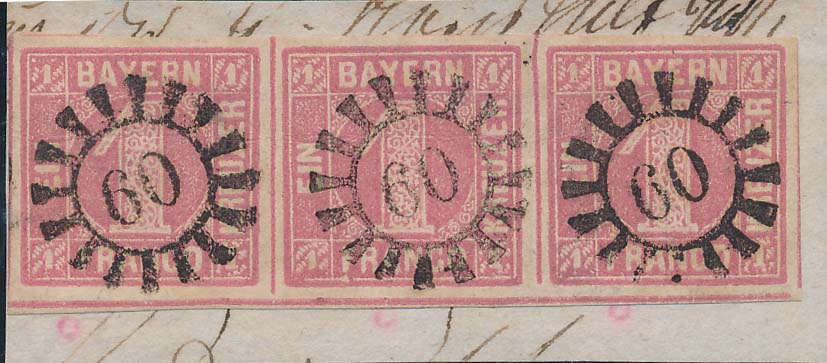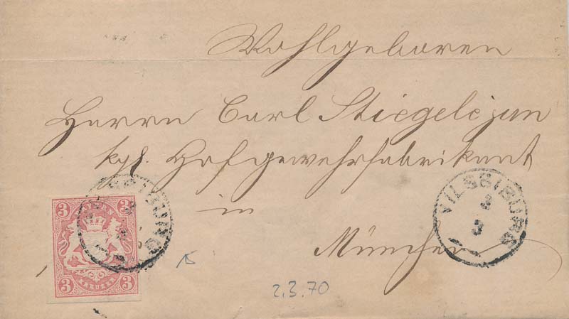"325" offen zentrisch glasklar auf Bf. mit riesenrandiger 3 Kr. Ziffer rot (mit mehreren Nachbarn!) u. nebenges. L2 "MÜNCHEN" nach Neuötting |