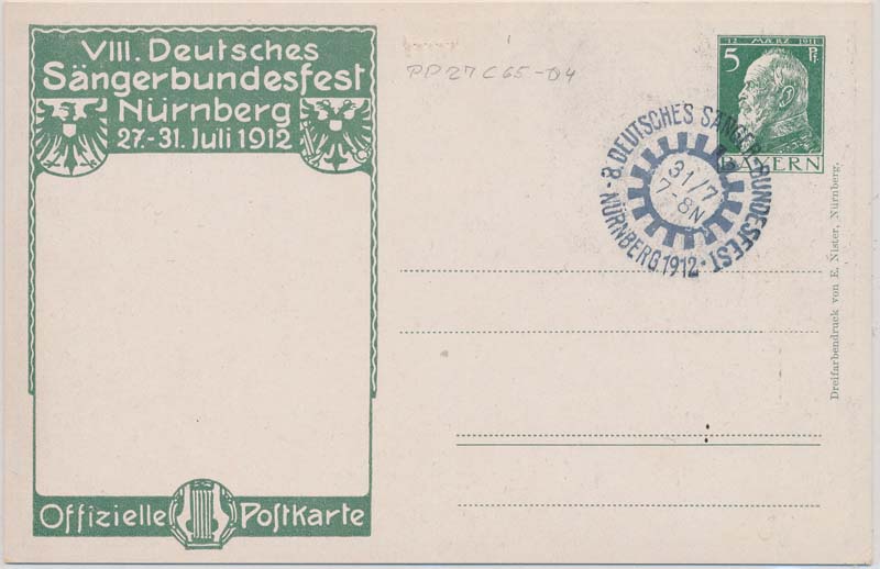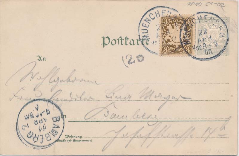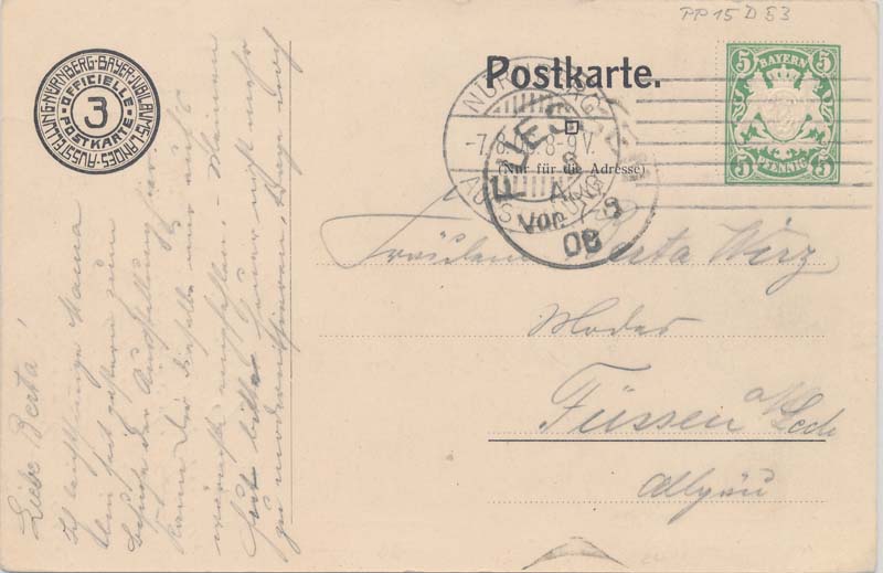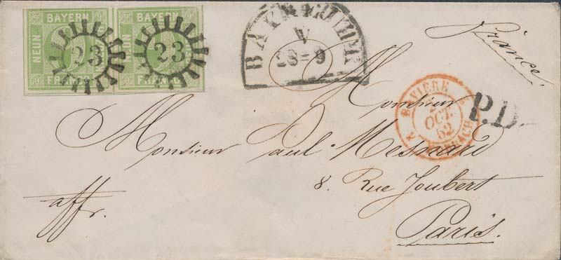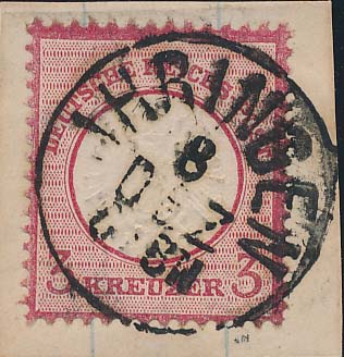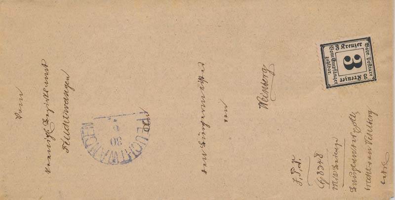 "386" zentrisch glasklar auf Bf. mit breitrandiger (4 Schnittlinien!) 3 Kr. Ziffer rot u. nebenges. HKS "PEGNITZ" nach Bayreuth |