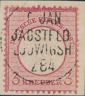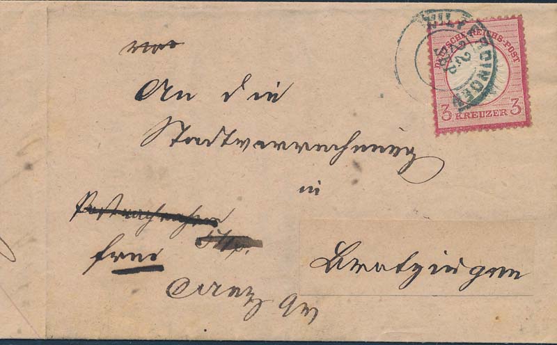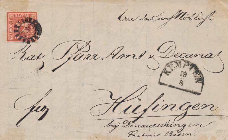 "454" zentrisch glasklar auf Vorderseite mit voll bis breitrandiger 3 Kr. Ziffer rot u. nebenges. HKS "SCHAMHAUPTEN" nach Eichstädt |