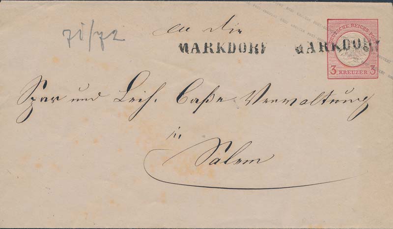 "416" ideal auf Bf. mit breitrandiger 3 Kr. Ziffer blau u. nebenges. HKS "MARKTREDWITZ" nach Gefrees |