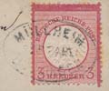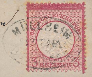 "315" zentrisch glasklar auf Bf. mit voll bis überrandiger 3 Kr. Wappen u. nebenges. HKS "MILTENBERG" nach Hoenigshofen |
