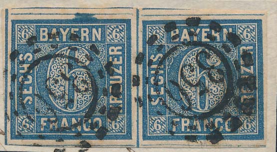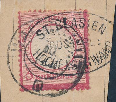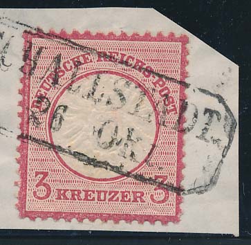 "508" offen zentrisch glasklar auf Bf. mit breitrandiger (4 Schnittlinien!) 6 Kr. Ziffer blau u. nebenges. HKS "STRAUBING" |