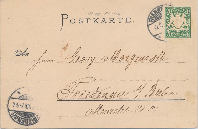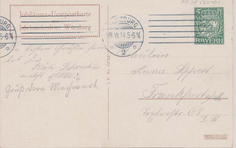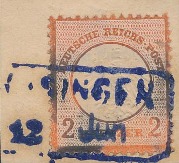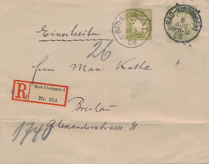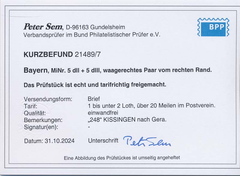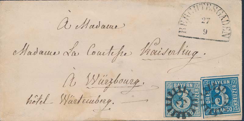 "248" offen 2 mal zentrisch glasklar auf Bf. mit breitrandigen 3 Kr. Ziffer blau u. nebenges. HKS "KISSINGEN" nach Frankfurt |