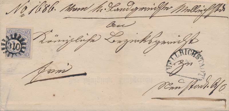 "322" zentrisch glasklar auf Bf. mit breitrandiger 3 Kr. Ziffer blau u. nebenges. HKS "MOOSBURG" nach Regensburg |