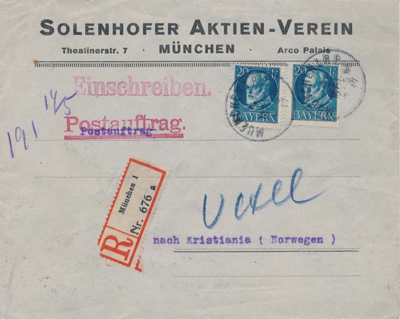 "443" 2 mal zentrisch glasklar auf Vorderseite eines Charge-Bf. gegen Rückschein! mit 6 Kr. Ziffer braun (l. Marke angeschnitten sonst breitrandig) u. nebenges. HKS "RHEINZABERN" nach München. Besserer Stpl.! u. hier noch in interessanter Kombination! |