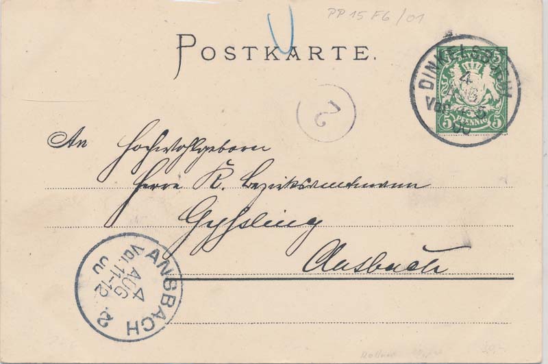 "522" zentrisch glasklar auf Bf. mit breitrandiger 3 Kr. Ziffer blau u. nebenges. HKS "AIDENBACH" nach Vilshofen |