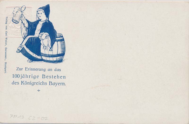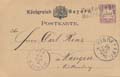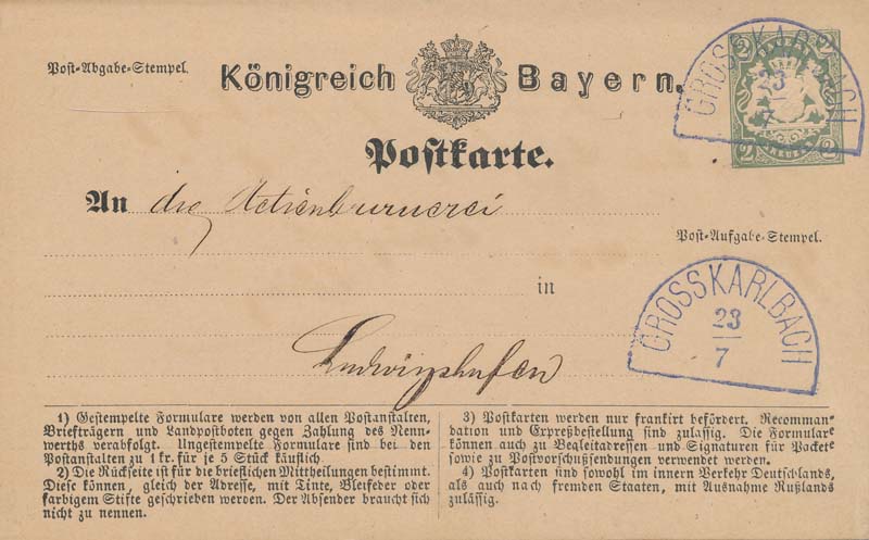 "GROSSKARLBACH" blauer HKS 2 mal glasklar auf GA-Karte 2 Kr. Wappen nach Ludwigshafen |