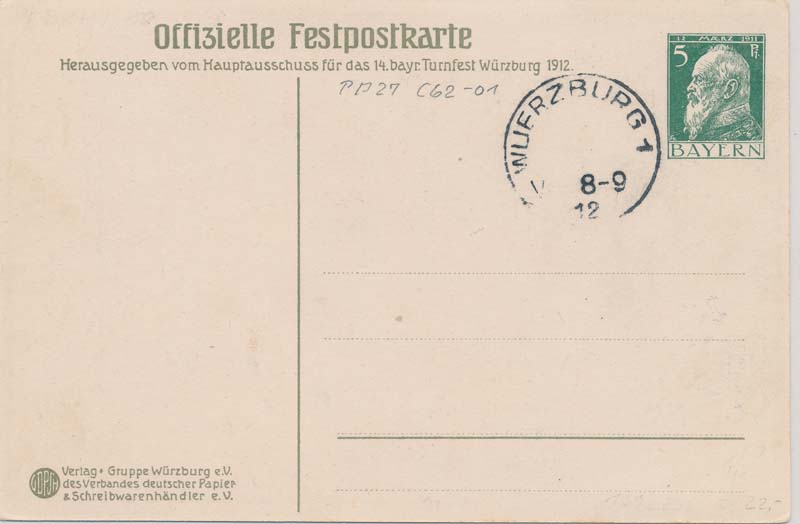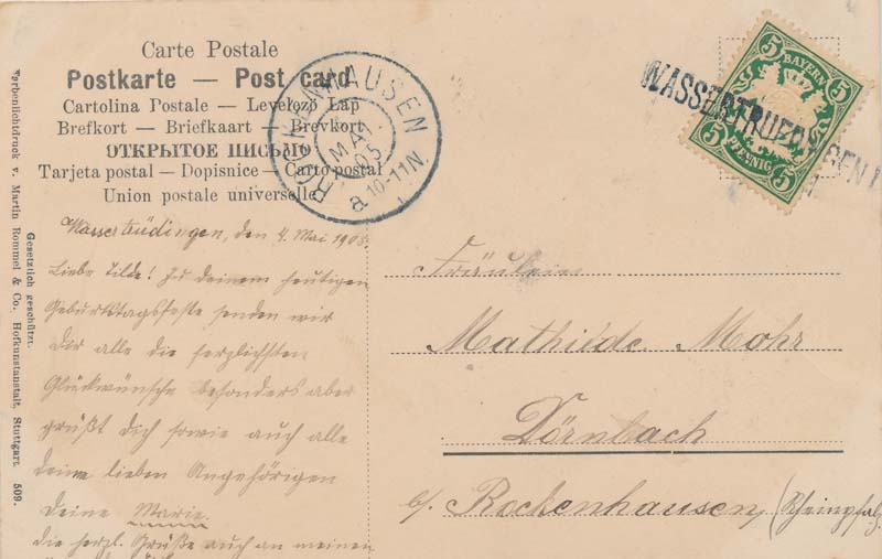 "WASSERTRUEDINGEN" L2 glasklar auf Pk mit EF 5 Pf. Wappen nach Dörnbach |
