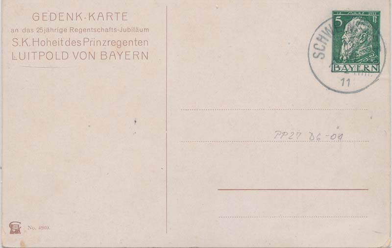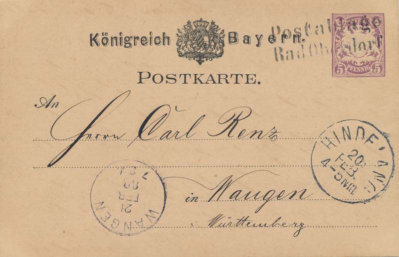"Postablage/Bad Oberdorf" in schwarz glasklar auf GA-Karte 5 Pf. Wappen lila nach Wangen |