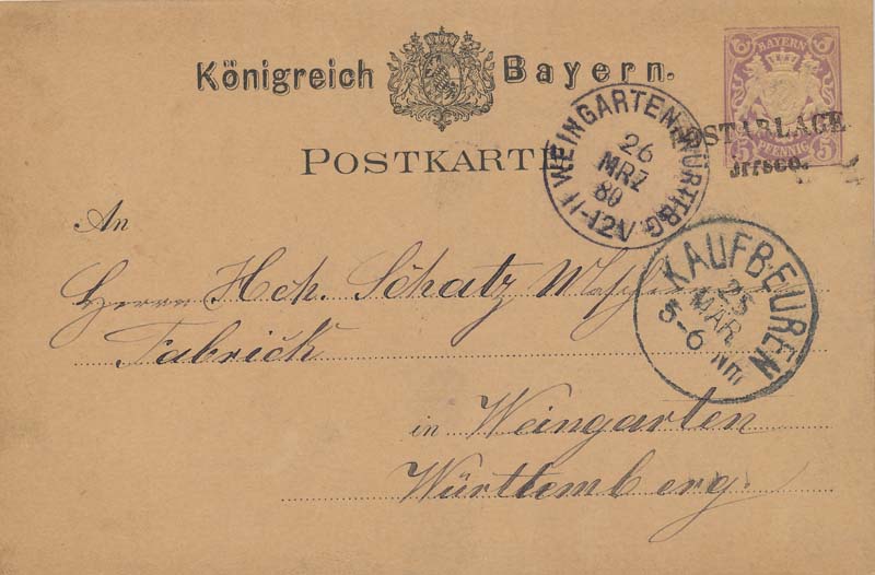 "POSTABLAGE/Irrsee" glasklar auf GA-Karte 5 Pf. Wappen lila nach Weingarten |