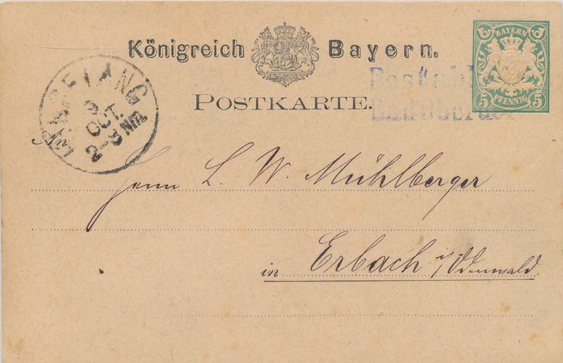 "Postablage/Bad Oberdorf" in blau klar auf GA-Karte 5 Pf. Wappen nach Erbach |