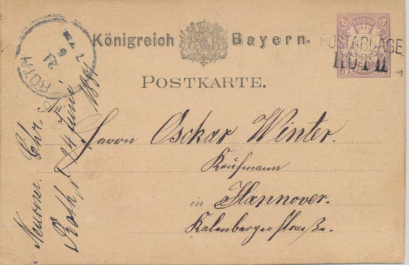 "POSTABLAGE/ROTH" glasklar auf GA-Karte 5 Pf. Wappen lila nach Hannover |