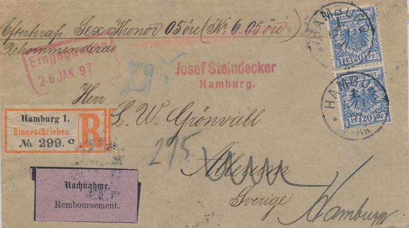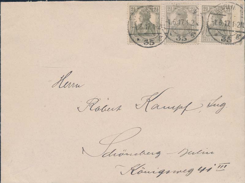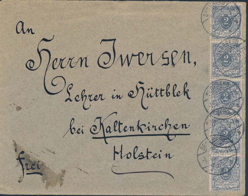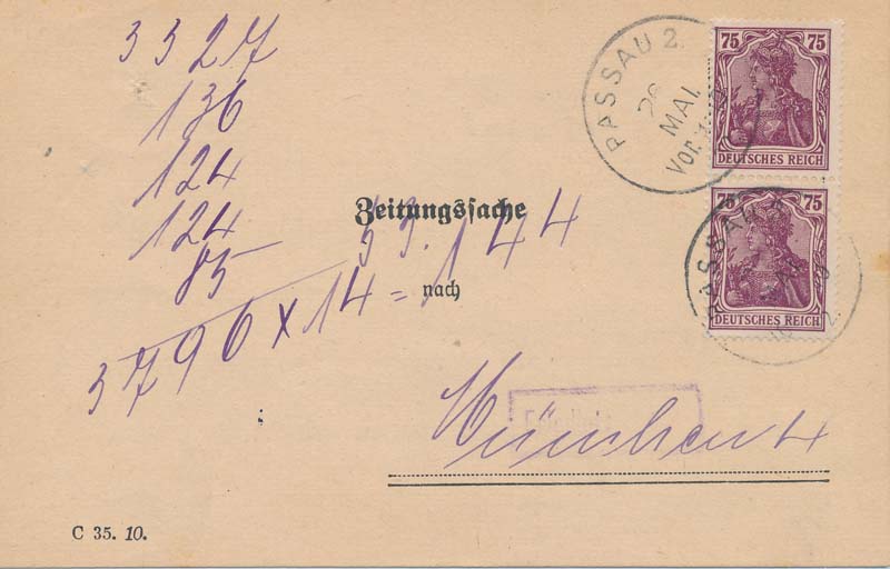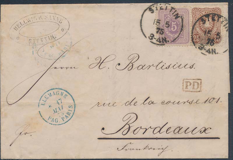 5 u. 25 Pfe "a"-Farbe zusammen auf Auslandsbf. ab Stettin vom 15.5.75 nach Frankreich, etwas unfrisch gepr. Jäschke-L. |