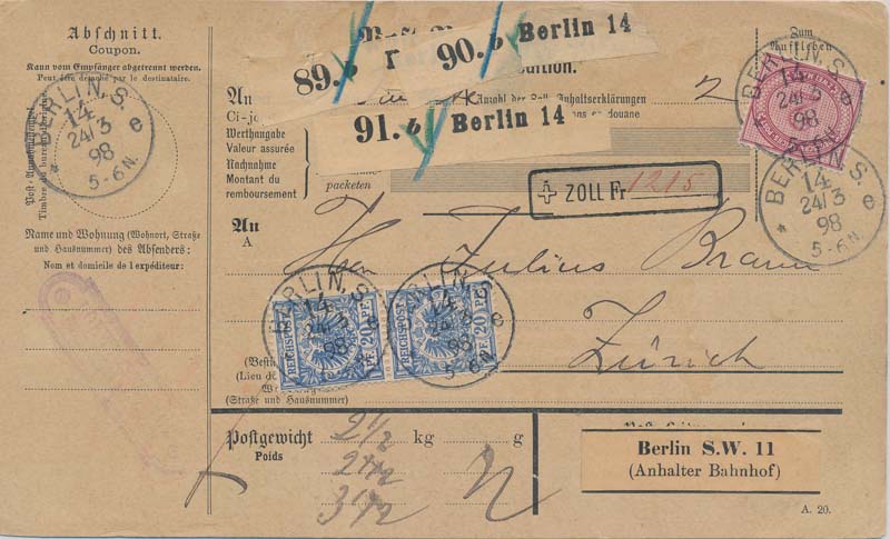 2 Mk Ziffer u. 20 Pf. Krone-Adler zusammen auf Auslands-Paketkarte ab Berlin vom 24.3.98 in die Schweiz |
