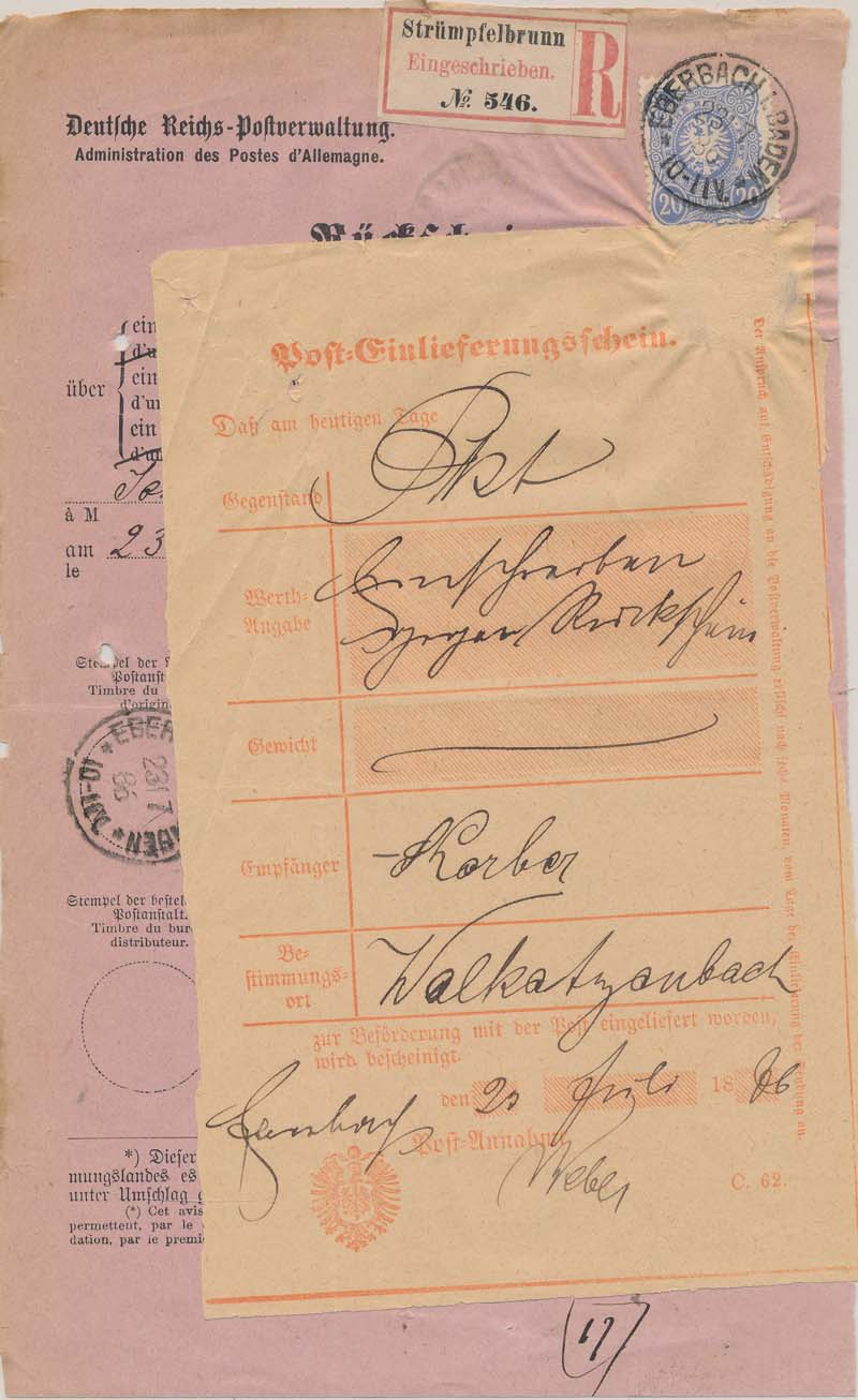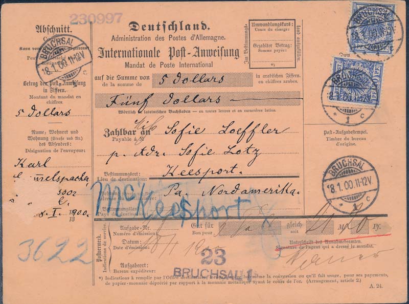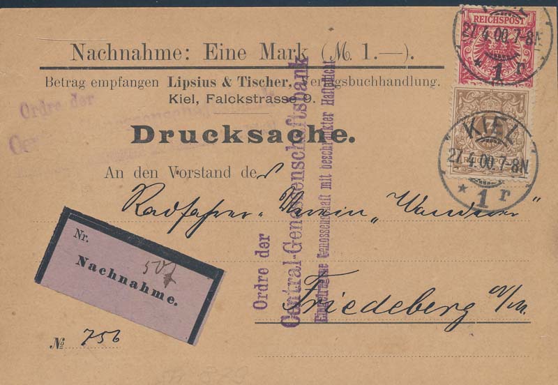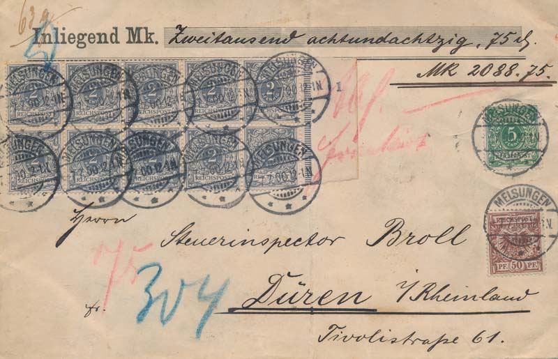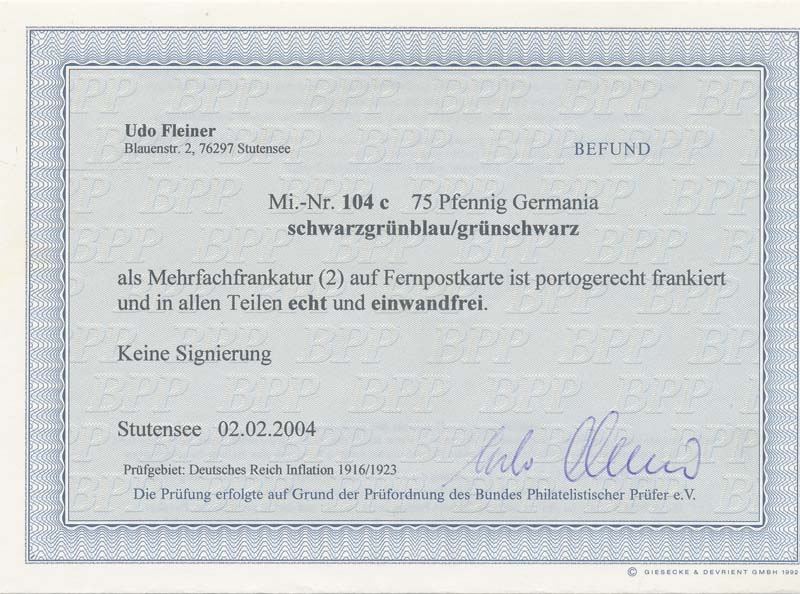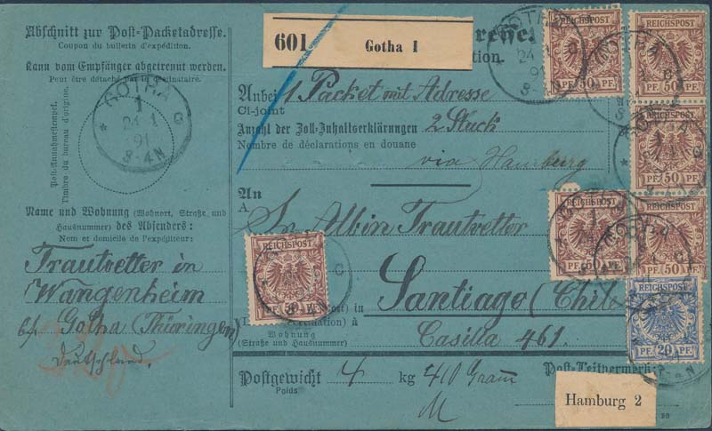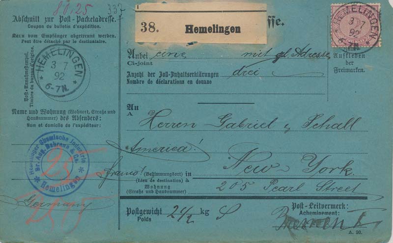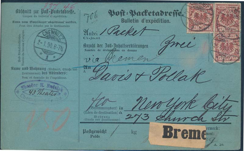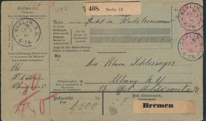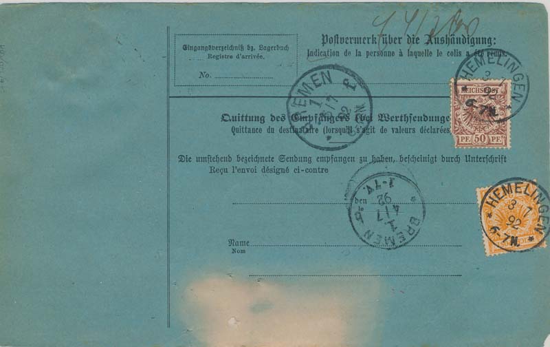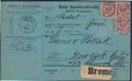2 Mk. Ziffer "e"-Farbe mit 25 u. 50 Pf. Krone-Adler "b" u. "d"-Farbe (vorder u. rücks. frankiert) auf Übersee-Paketkarte ab Hemelingen vom 3.7.92 in die USA 50 Pf. Eckfehler gepr. Wiegand |
