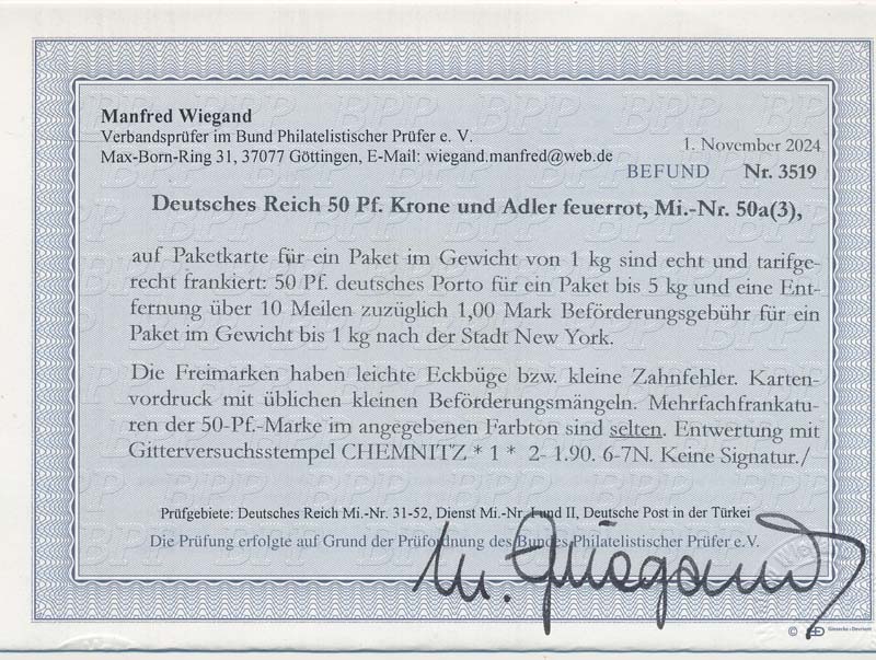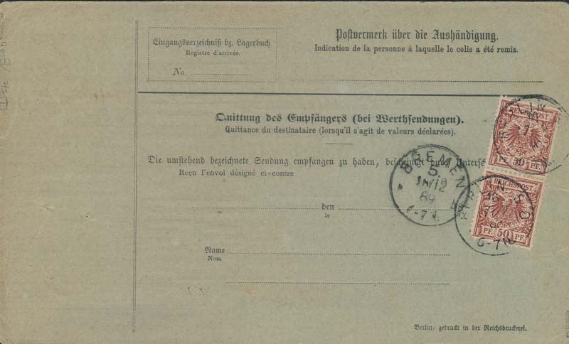 2 Mk. Ziffer "c"-Farbe im u. 50 Pf. Krone-Adler "b"-Farbe (vorder u. rücks. frankiert) auf Übersee-Paketkarte ab Berlin vom 17.2.89 in die USA 2 Mk Randklebung u. 1 mal 50 Pf. kl. Eckfehler gepr. Wiegand |
