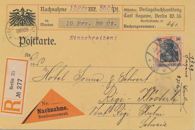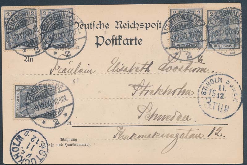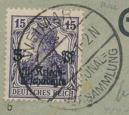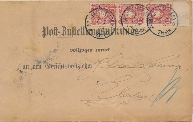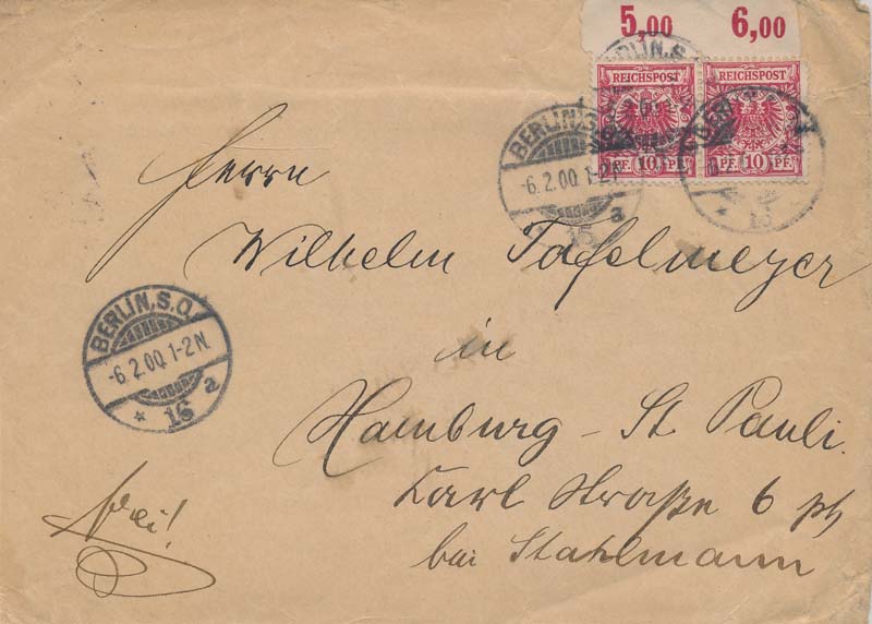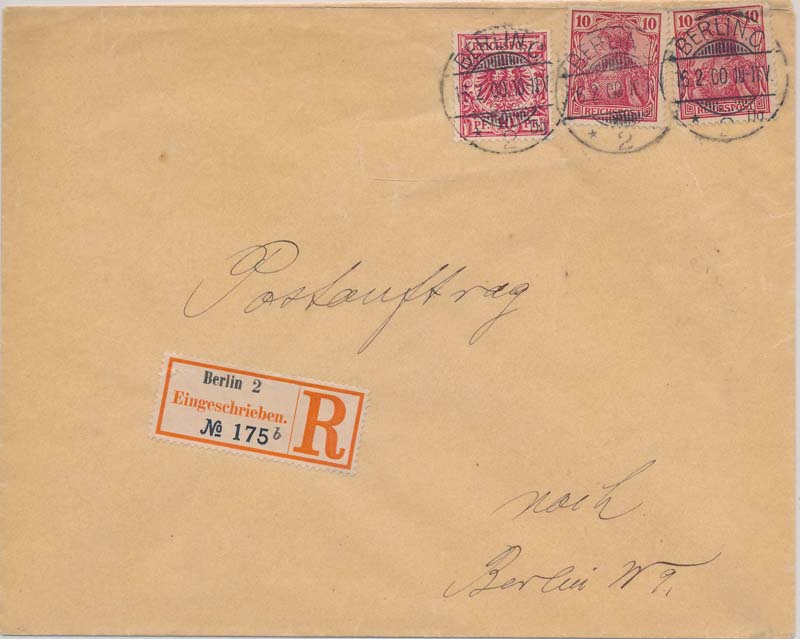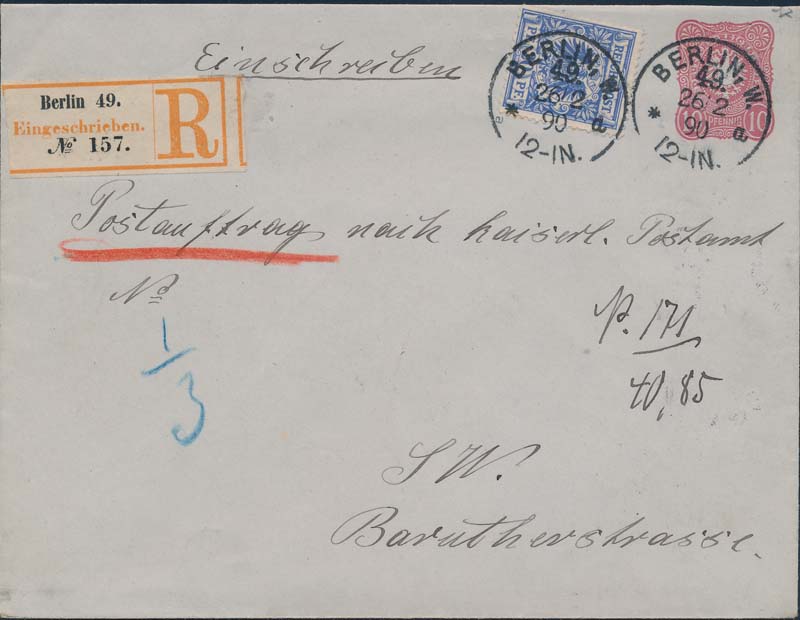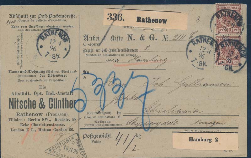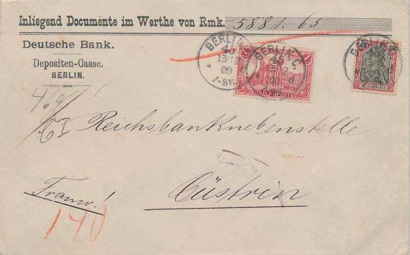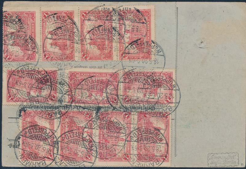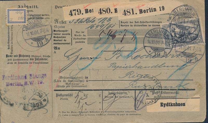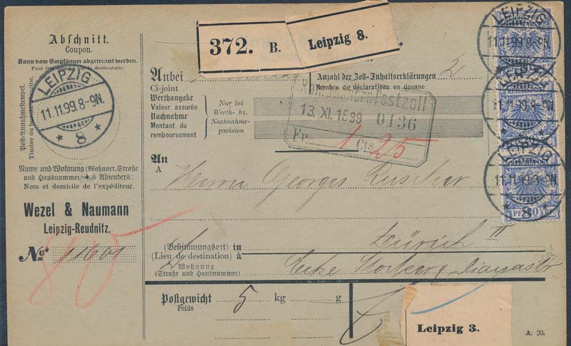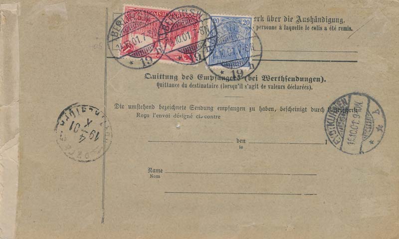 2 Mk Ziffer mit 5 u. 10 Pf. Krone-Adler zusammen auf Auslands-Wert-Paketkarte ab Berlin vom 2.12.99 nach Paris, sehr sauber u. mal ohne Faltbüge! |