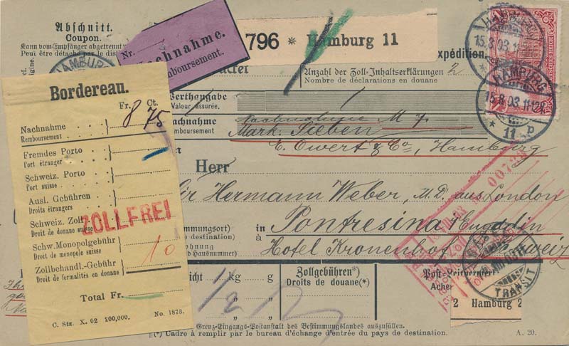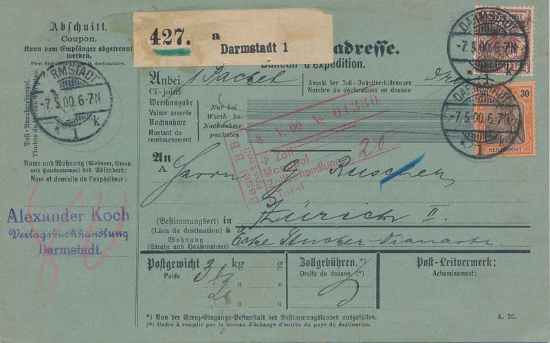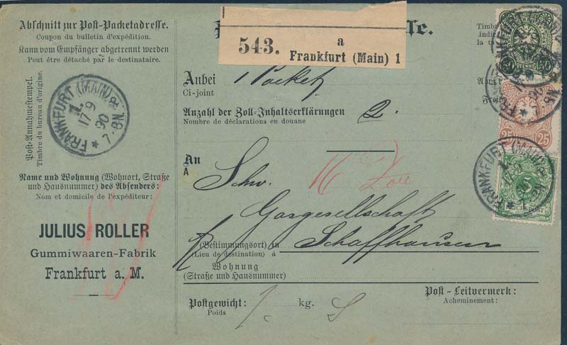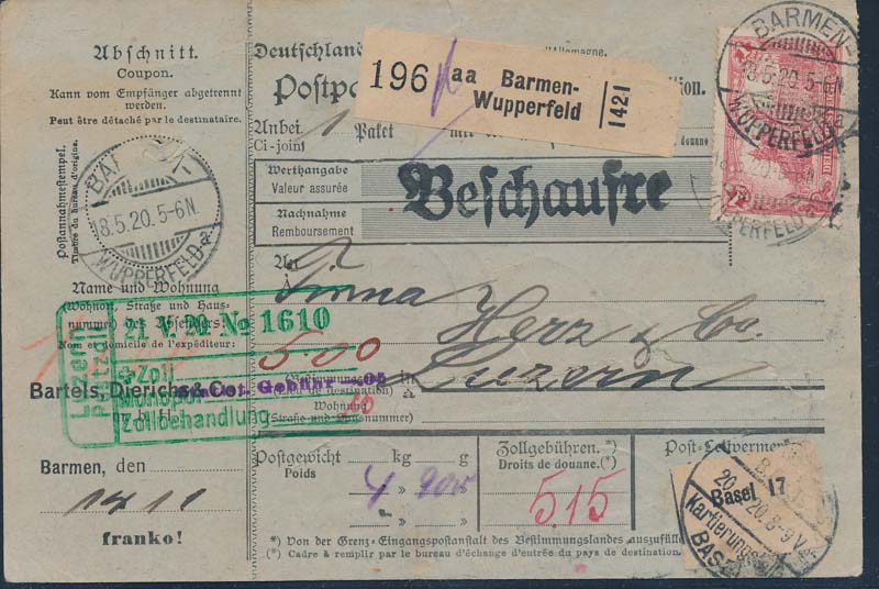 2 Mk Ziffer u. 20 Pf. Krone-Adler zusammen auf Auslands-Paketkarte ab Berlin vom 6.5.97 in die Schweiz |