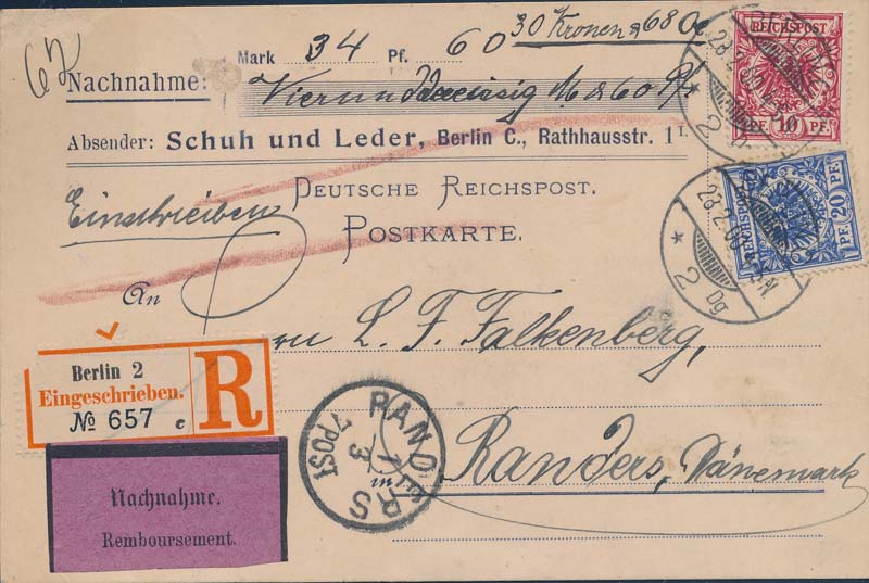 2 Mk Ziffer u. 20 Pf. Krone-Adler zusammen auf Auslands-Paketkarte ab Berlin vom 16.3.97 in die Schweiz |