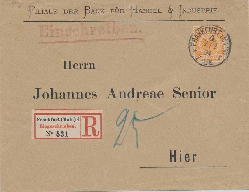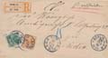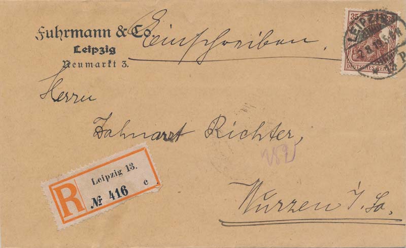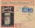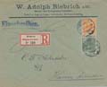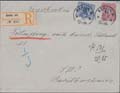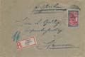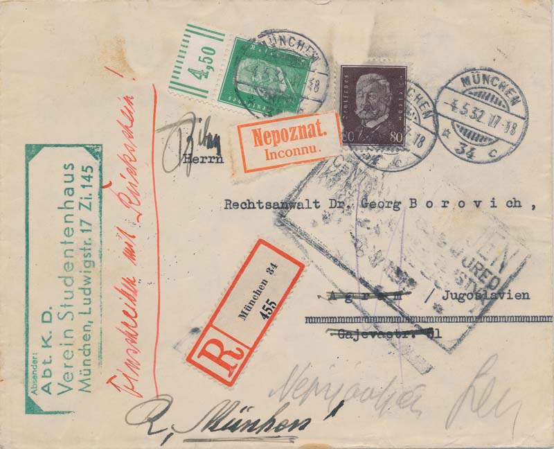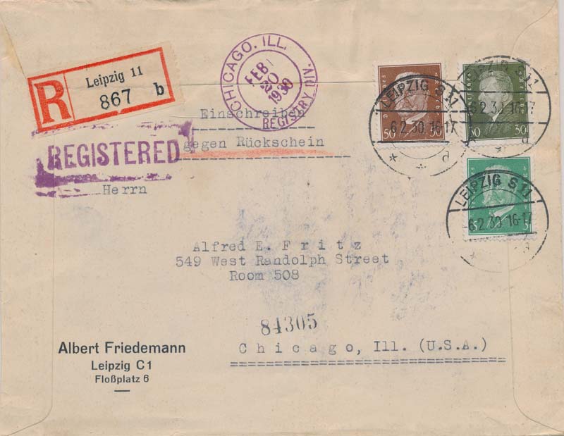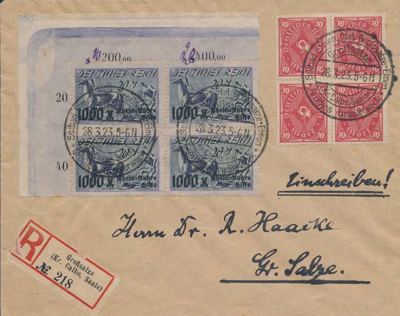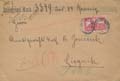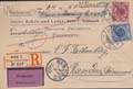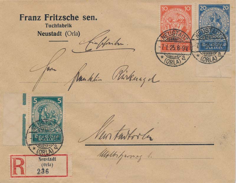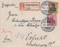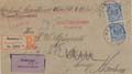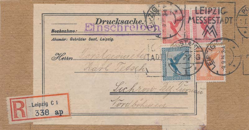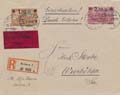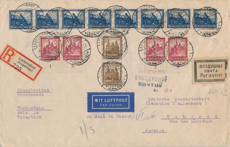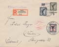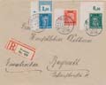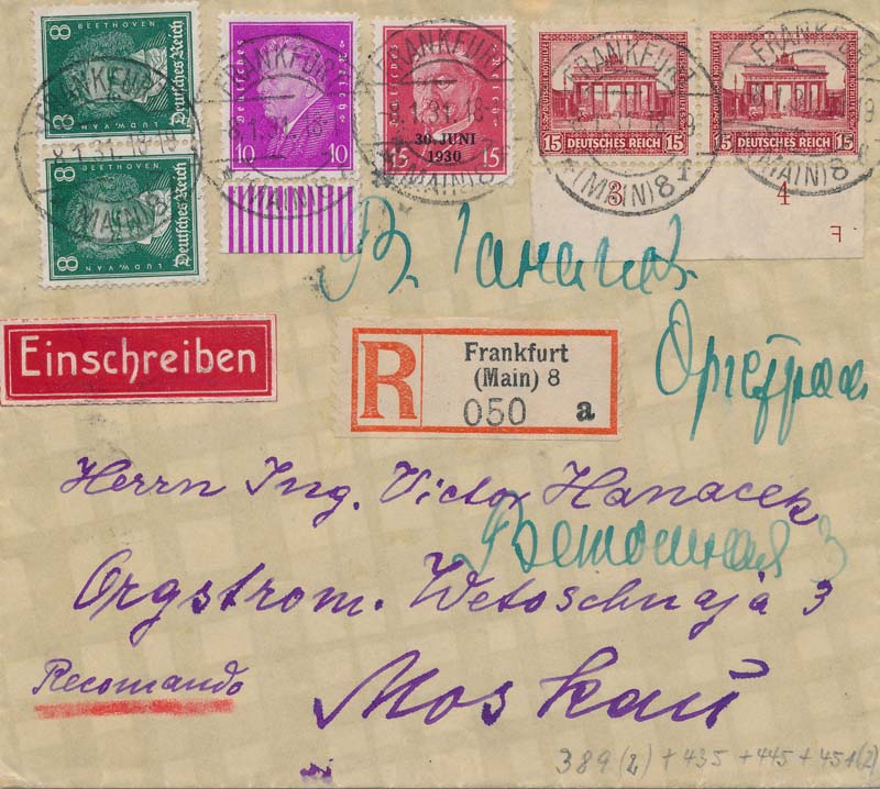 15 Pf. Nothilfe 1930 im vom Unterrand u. dort mit Druckerzeichen "F" (spiegelverkehrt) u. angegebene Zusatzfrankatur auf Ausland-R-Doppelbf. (1 Pf. zuviel) ab Frankfurt/M. vom 8.1.31 nach Moskau |