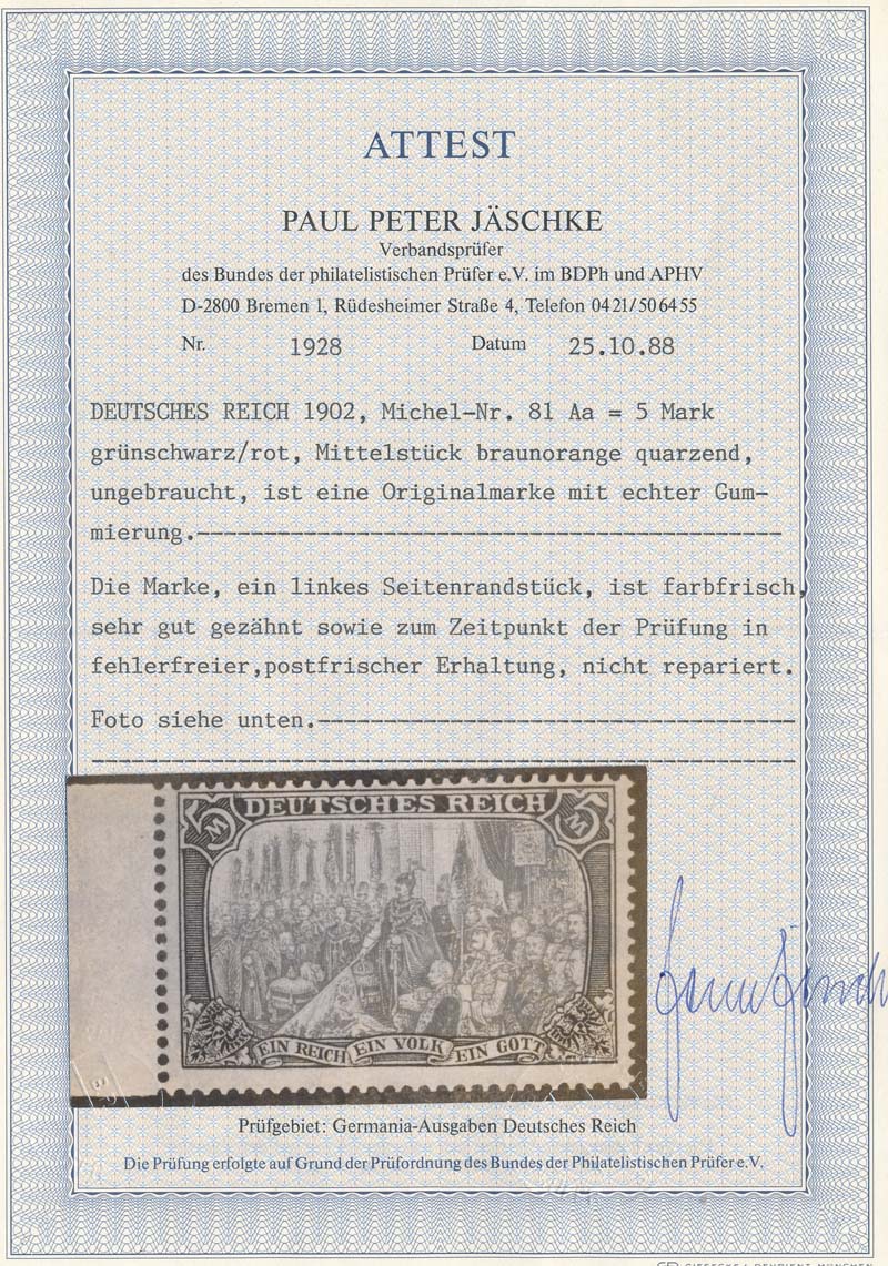 2 Mk Ziffer "a"-Farbe als Neudruck von 1899 postfrisch Pracht sign. u.a. Pfenninger u. neues Fotoattest Wiegand "echt u. einwandfrei" |