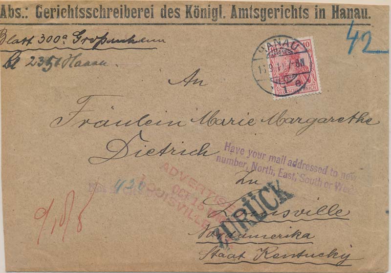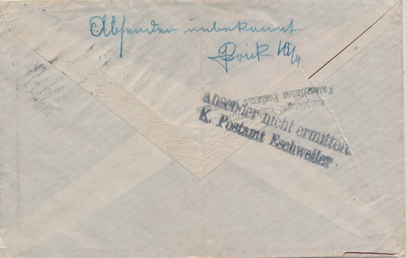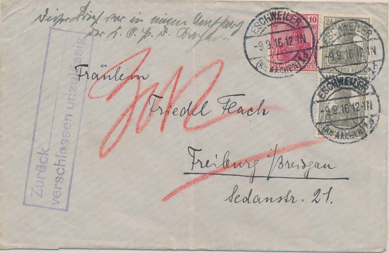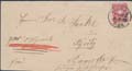 10 u. 20 Pfe zusammen auf R-Bf. ab Strassburg vom 1.5.78 nach Dorlisheim u. zurück, dabei 10 Pfe vom l. Bogenrand u. unten mit ZW-Steg, rücks. Ra1 in rot "Unzustellbar" |